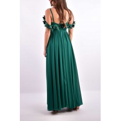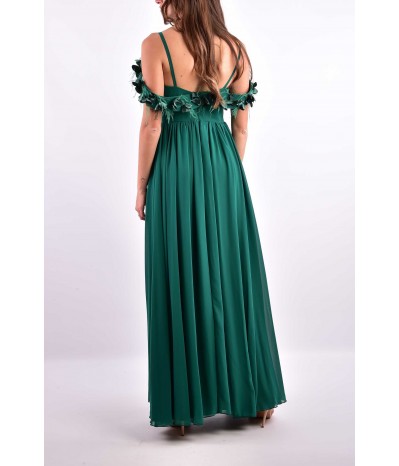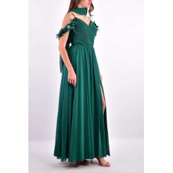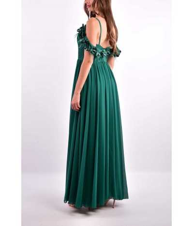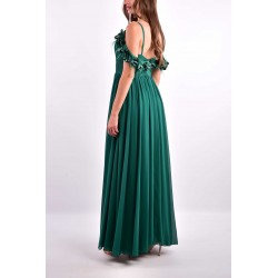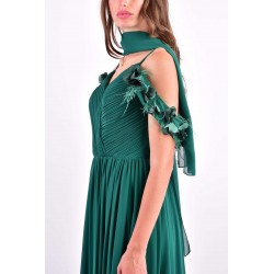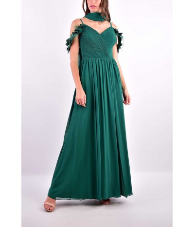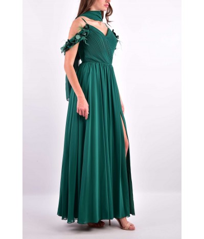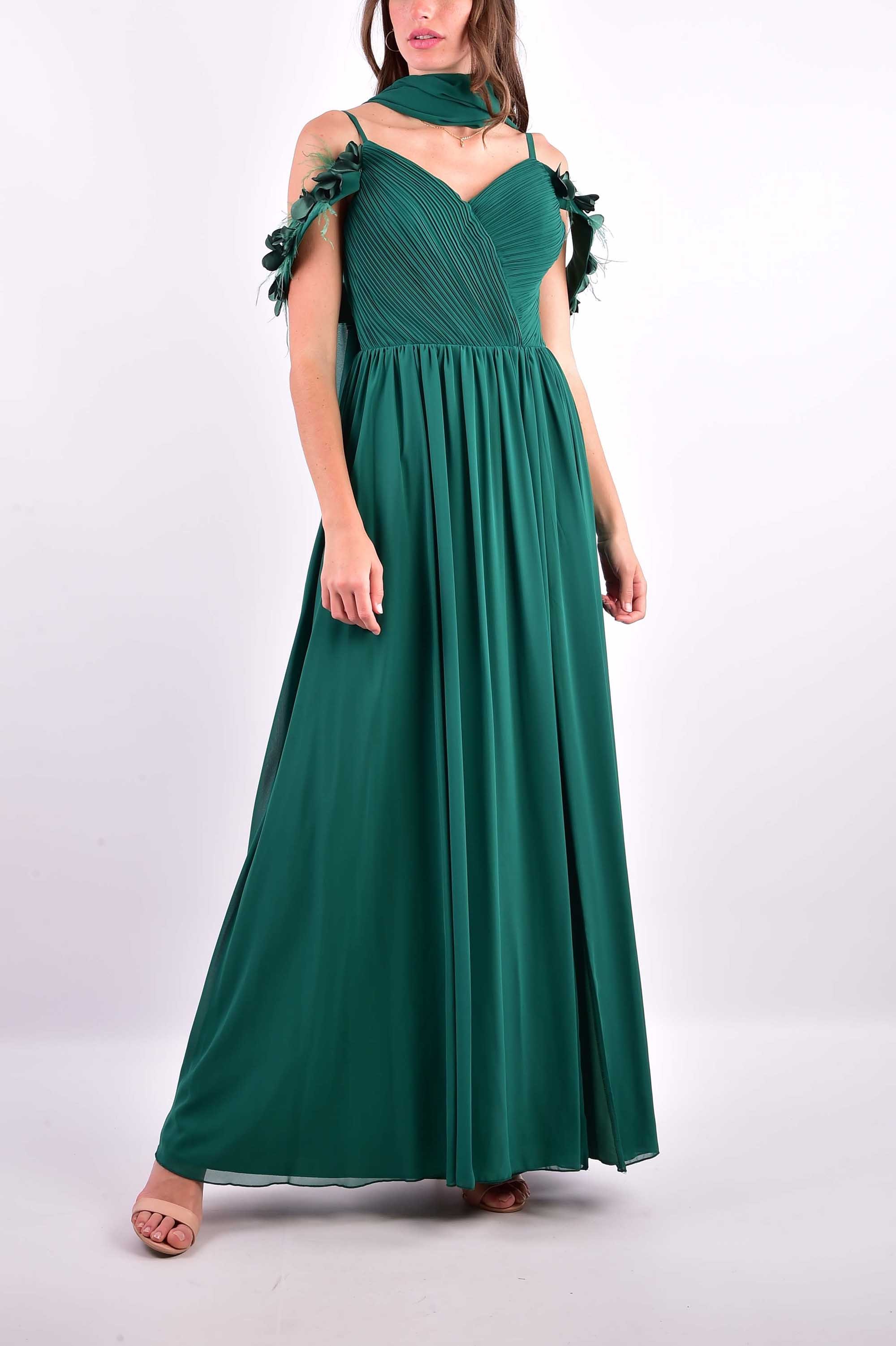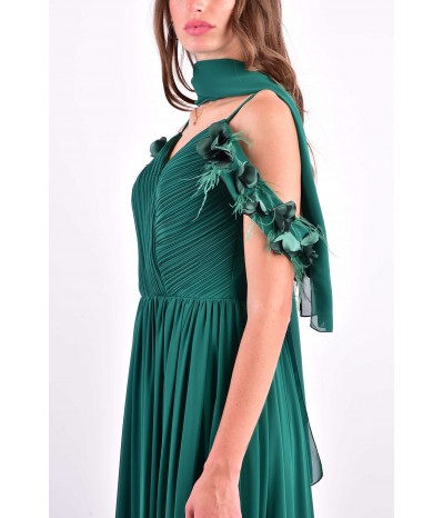 Abito lungo Romeo Gigli corpetto plissè con spalline sottili e fascia omerale con applicazioni di fiori e piume, gonna a ruota e stola coordinata