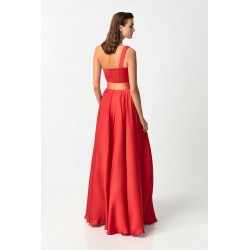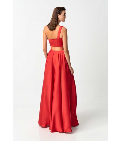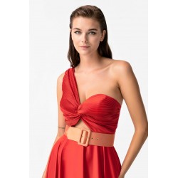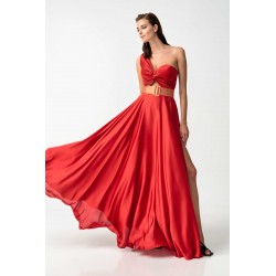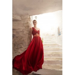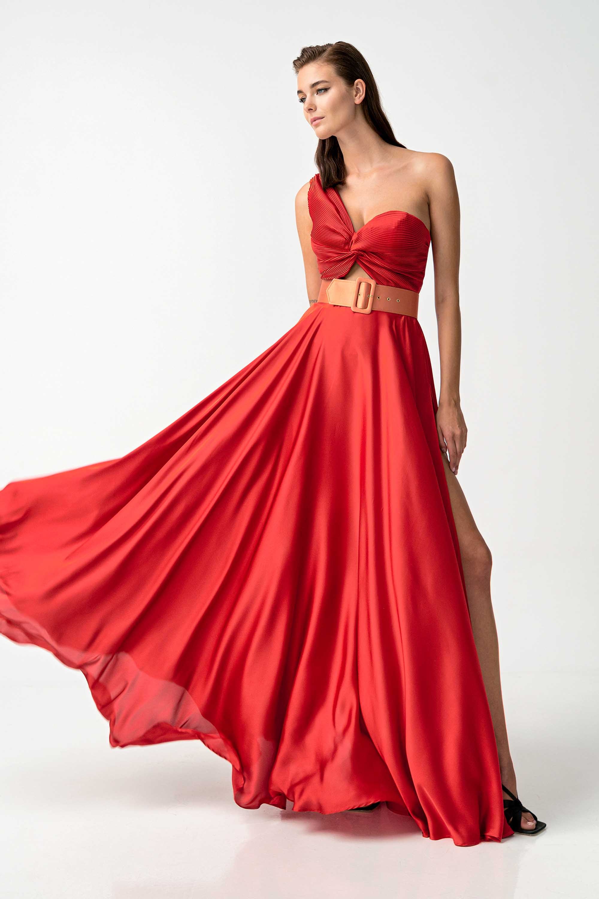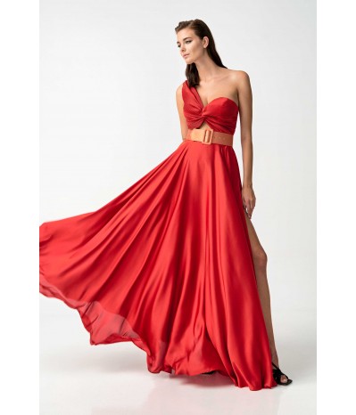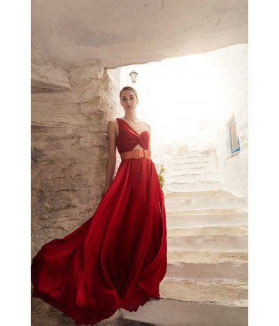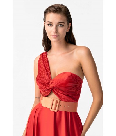 Abito lungo My Angels con corpetto plissè monospalla, gonna a ruota effetto seta con spacco laterale, cintura coordinata fucsia in contrasto di colore