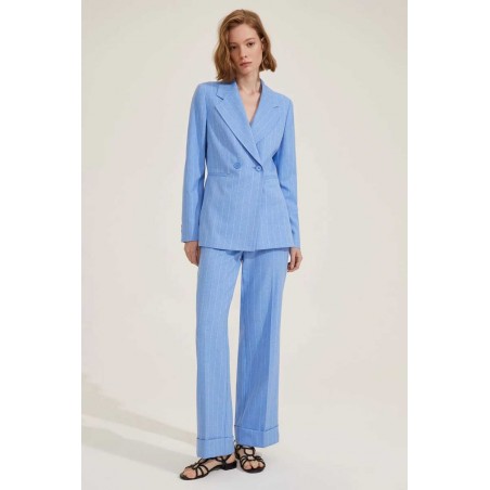 Il tailleur Emme Marella rappresenta l'eleganza sofisticata e la modernità sartoriale. Composto da una giacca doppio petto gessata, questo capo si distingue per il suo motivo a scacchi classico, che conferisce un tocco di raffinatezza e stile intramontabile. La giacca presenta una vestibilità strutturata, con bottoni doppi che accentuano la silhouette e conferiscono un aspetto formale. Abbinato a un pantalone palazzo con risvolto, il tailleur offre una combinazione di comfort e grazia, ideale per valorizzare la figura femminile con un taglio ampio e fluido. I risvolti sui pantaloni aggiungono un dettaglio chic e contemporaneo, rendendo l'insieme perfetto per occasioni lavorative, eventi formali o momenti speciali.
