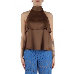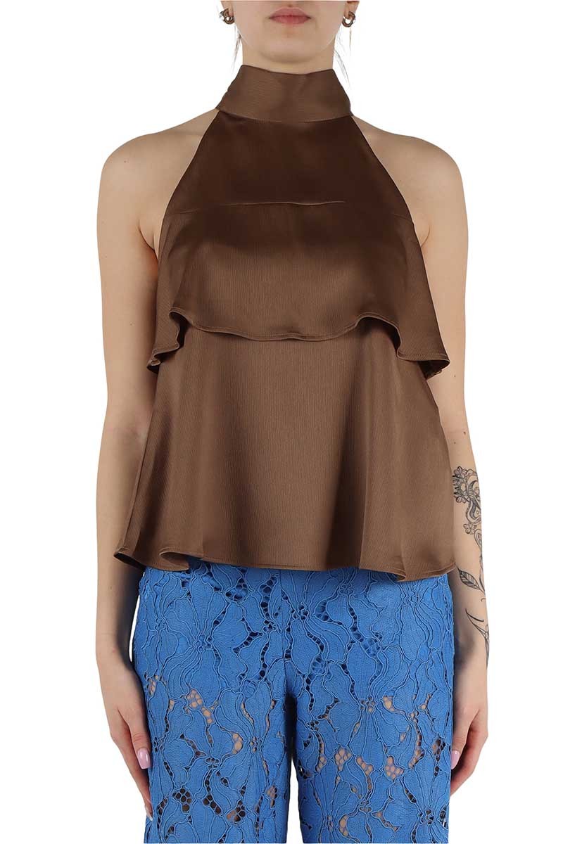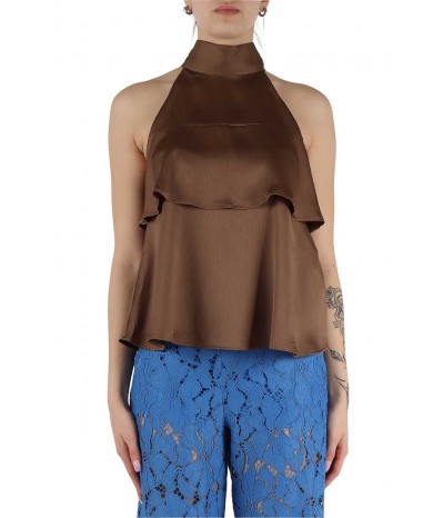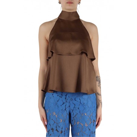Top Emme Marella in tessuto increspato lucido, un capo sofisticato e femminile perfetto per look eleganti e raffinati. Il design con collo annodato esalta la silhouette, mentre le balze leggere donano movimento e un tocco romantico al modello. Realizzato in un tessuto luminoso di alta qualità, questo top è ideale per occasioni speciali o per aggiungere un accento glamour ai tuoi outfit quotidiani.