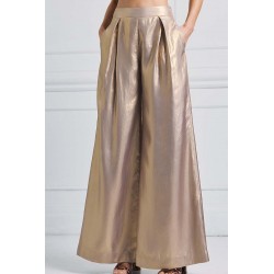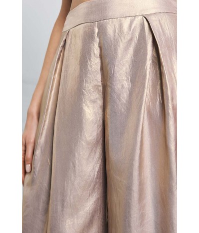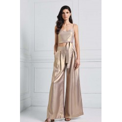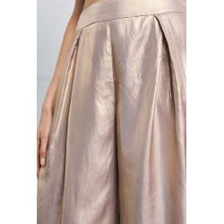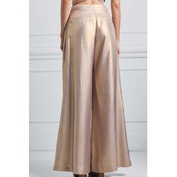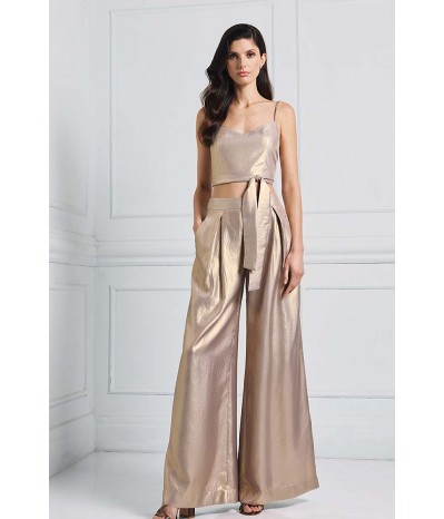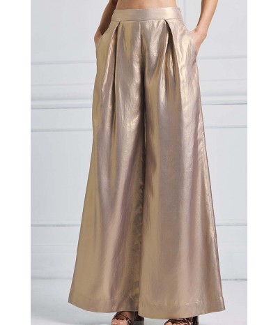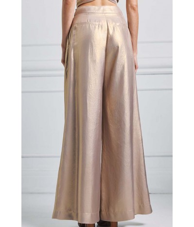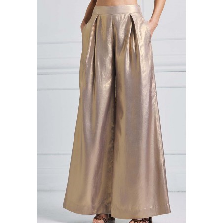 Pantalone Metallico Access Fashion modello palazzo con pence frontali offre un fit fluido e slanciato, valorizzando la silhouette con eleganza. La vita alta esalta le forme, mentre le tasche a filo laterali aggiungono un tocco discreto e funzionale. Il finish metallico dona luminosità e carattere, rendendolo ideale per outfit da sera o occasioni speciali.