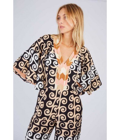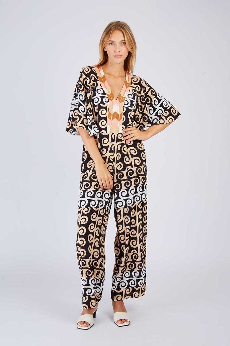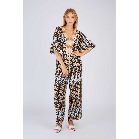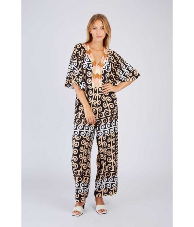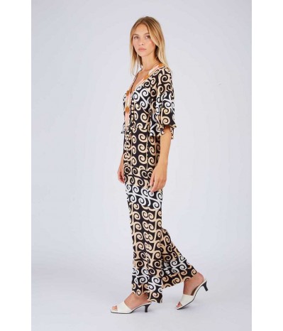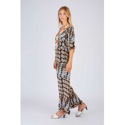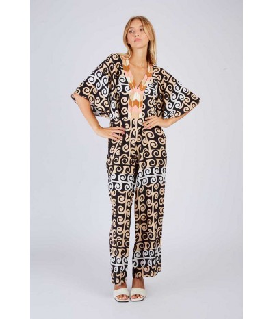 Tuta René Derhy in morbida viscosa fantasia, un capo ricercato e femminile perfetto per un look elegante e originale. Il design è impreziosito da maniche ampie che donano fluidità e movimento, mentre la scollatura decorata con paillettes aggiunge un tocco luminoso e sofisticato. La chiusura con zip sulle spalle è un dettaglio moderno e funzionale, che valorizza il design con stile.