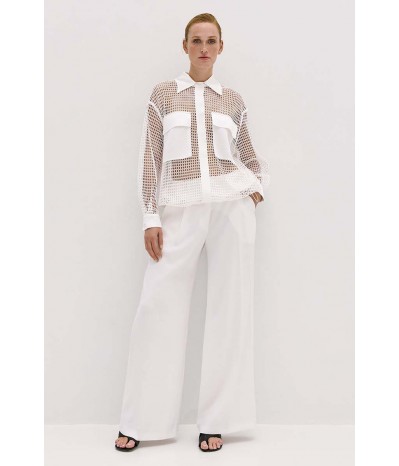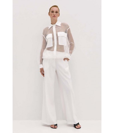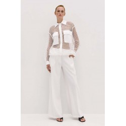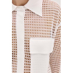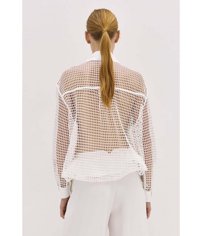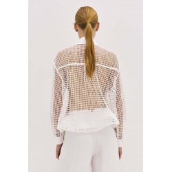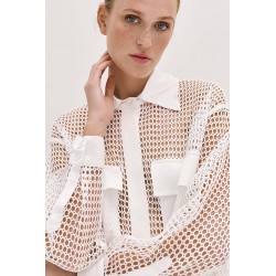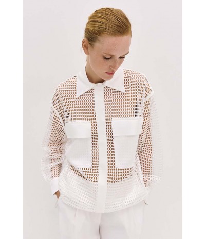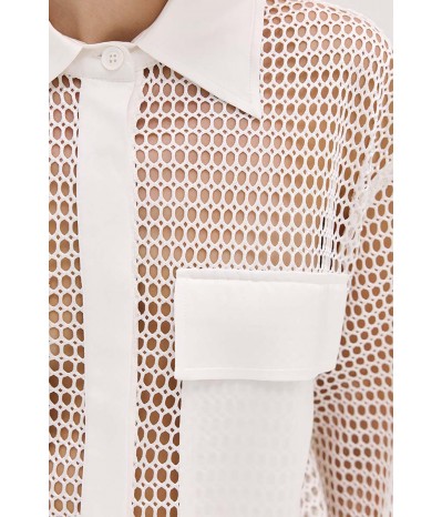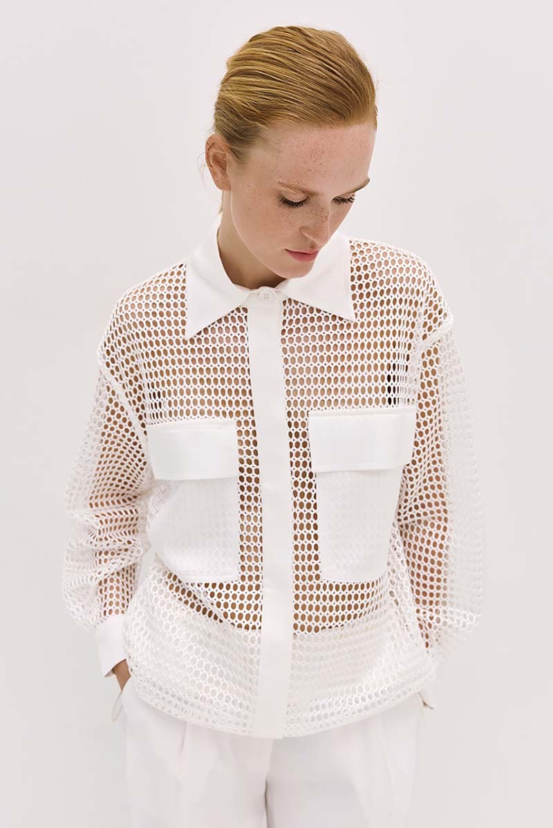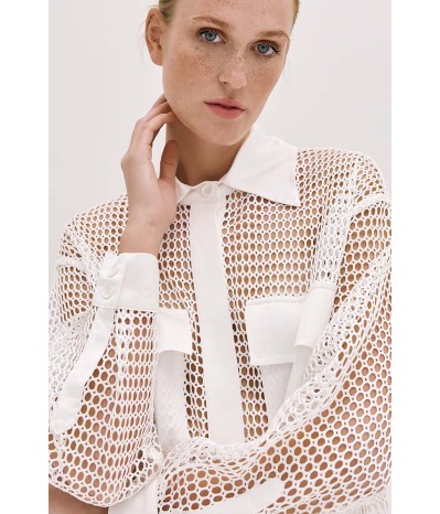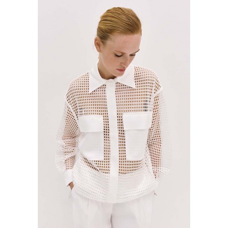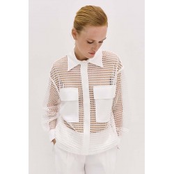 Giacca-Camicia Access Fashion, un capo originale e di tendenza che unisce leggerezza e stile. Realizzata in tessuto traforato effetto rete, dona un look moderno e arioso. E'completato da tasche applicate, colletto e polsini in tessuto effetto seta, che creano un elegante contrasto di texture. La chiusura con bottoni sul davanti aggiunge praticità e versatilità, permettendo di indossarla sia come giacca leggera che come camicia strutturata.
