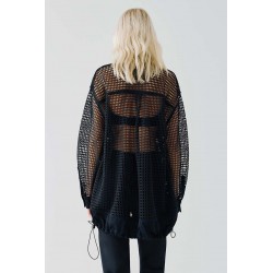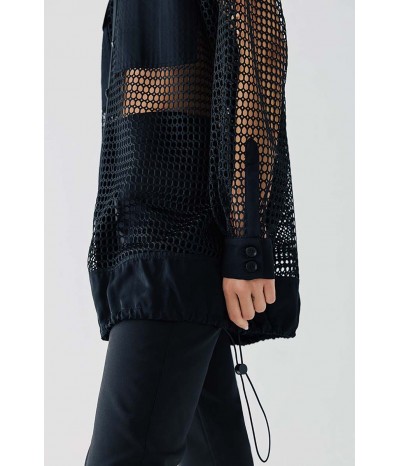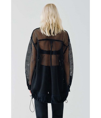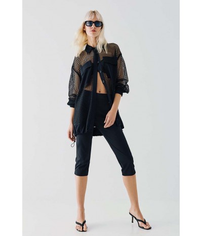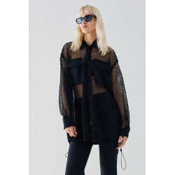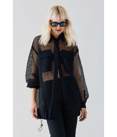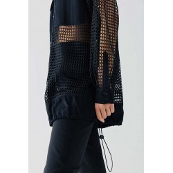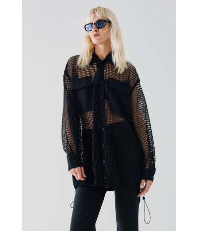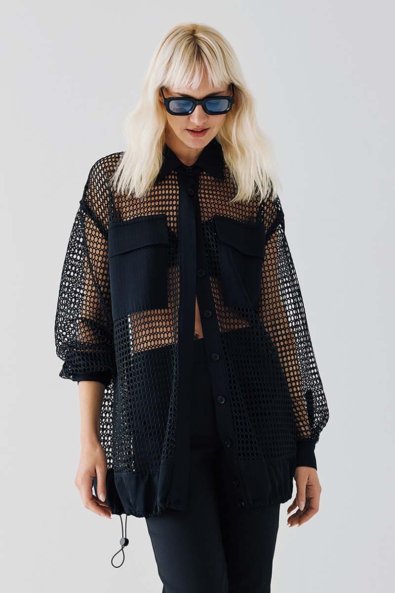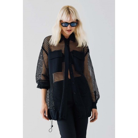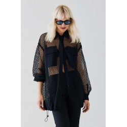 Giacca-Camicia Access Fashion, un capo originale e di tendenza che unisce leggerezza e stile. Realizzata in tessuto traforato effetto rete, dona un look moderno e arioso. E'completato da tasche applicate, colletto e polsini in tessuto effetto seta, che creano un elegante contrasto di texture. La chiusura con bottoni sul davanti aggiunge praticità e versatilità, permettendo di indossarla sia come giacca leggera che come camicia strutturata.
