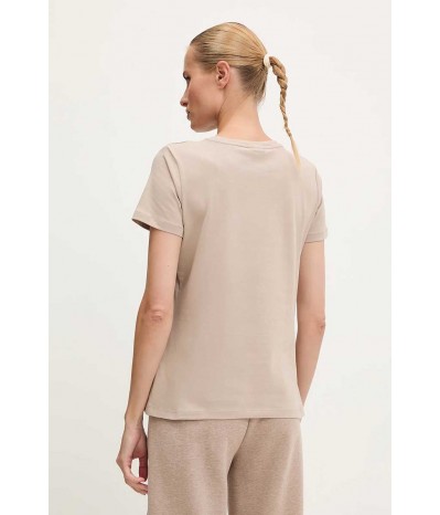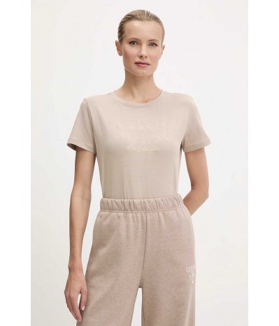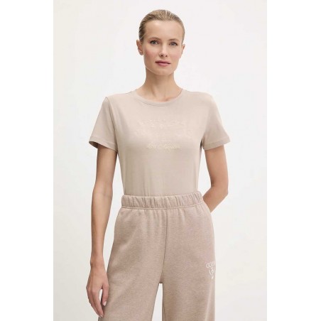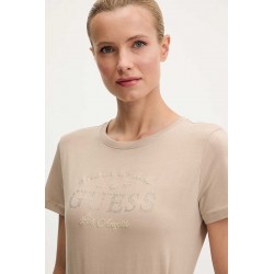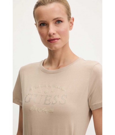 T-shirt Guess a manica corta con classico girocollo, realizzata in morbido cotone che assicura comfort e traspirabilità. Il design semplice e versatile è impreziosito dal logo frontale decorato con strass, dettaglio luminoso e raffinato che aggiunge un tocco glamour al capo.Un modello iconico e femminile, perfetto per creare outfit casual-chic.