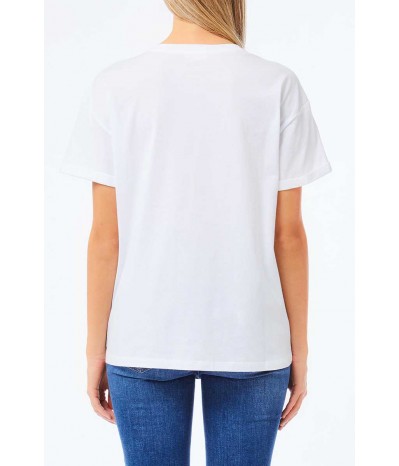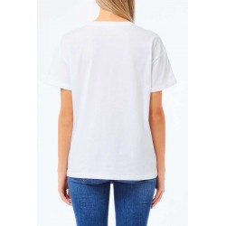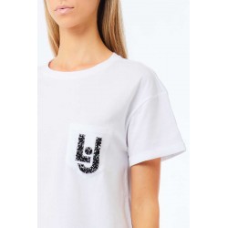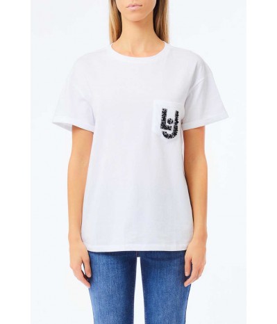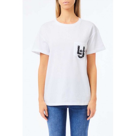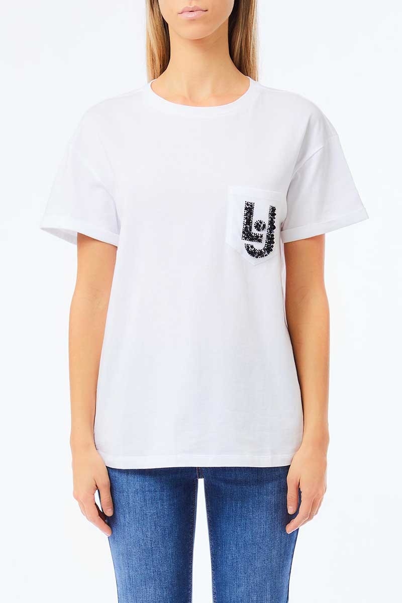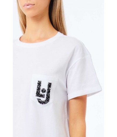 T-shirt Liu Jo realizzata in morbido cotone, dal design casual e raffinato. Il modello presenta un classico girocollo e maniche corte, impreziosito da un elegante taschino applicato sul petto, decorato con pietre e paillettes che donano luminosità e un tocco glamour al capo.