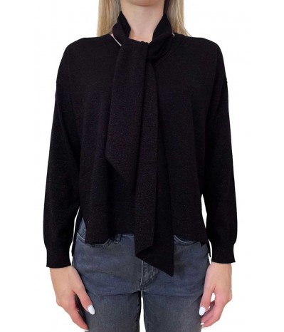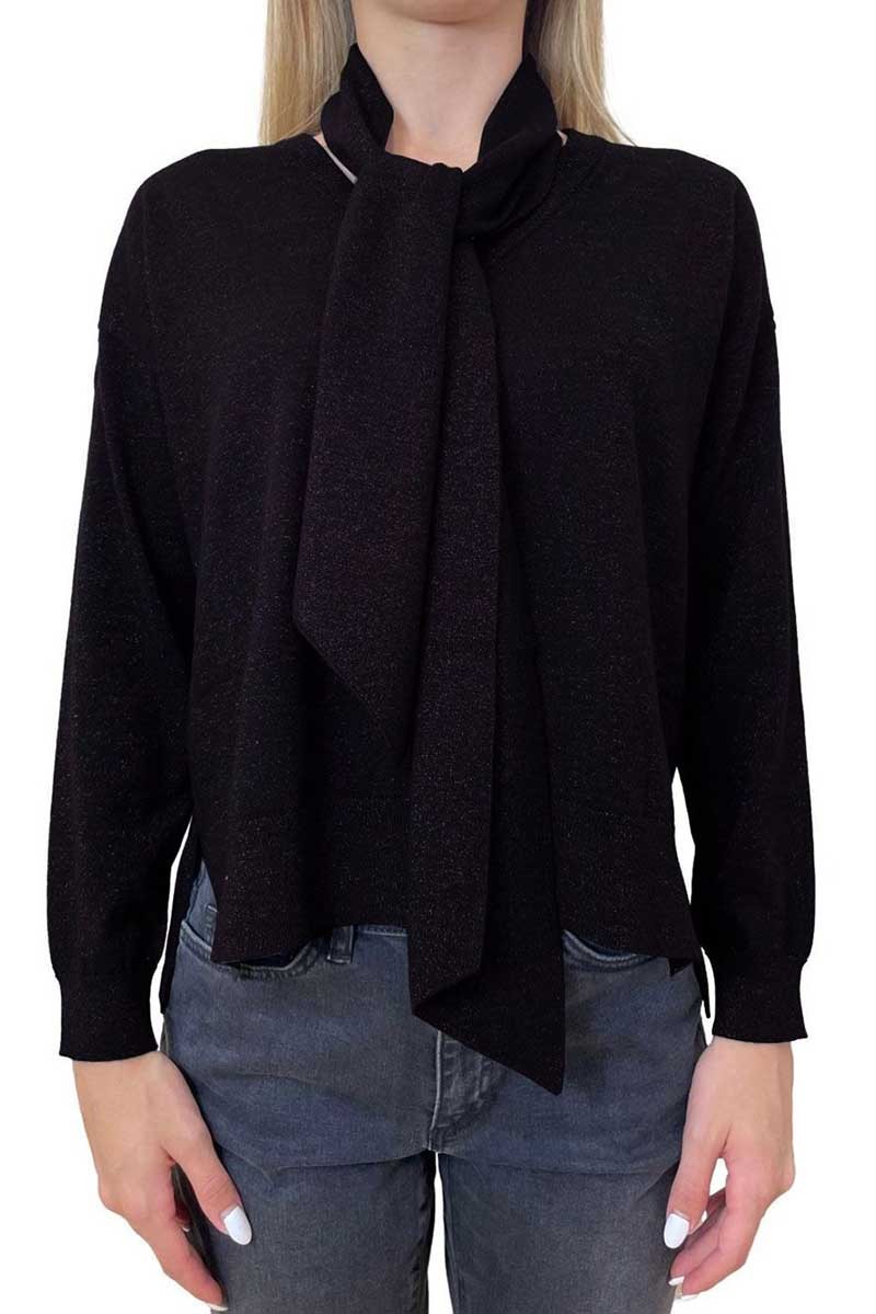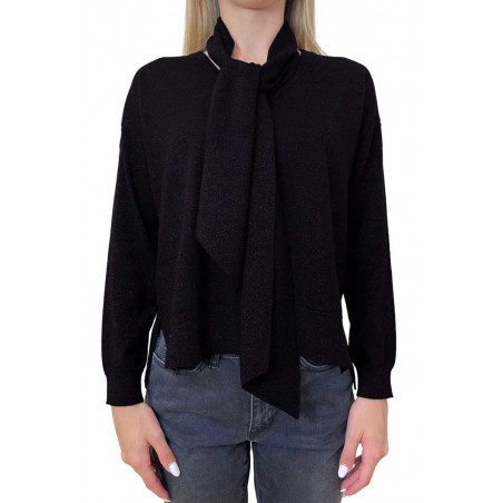 Maglia Emme Marella dal fascino sofisticato e luminoso, realizzata in filato tecnico di misto lana con inserti in lurex, che dona un delicato effetto brillante mantenendo calore e morbidezza. Il fit leggermente oversize e la manica lunga con spalla scesa assicurano comfort e uno stile contemporaneo.Lo scollo a V è impreziosito da una sciarpa staccabile coordinata, perfetta per aggiungere un tocco di eleganza o personalizzare il look. I bordi e lo scollo a costine completano il capo con una finitura curata e strutturata.