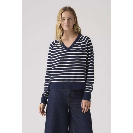 Maglia Levi’s dal design moderno e disinvolto, caratterizzata da una fresca fantasia a righe. Realizzata in morbido tessuto di qualità, presenta un elegante scollo a V e il caratteristico taglio modello scatoletta, con linea dritta e leggermente corta, pensata per uno stile giovane e contemporaneo.Un capo casual e versatile, ideale da indossare con denim o gonne a vita alta per completare look dal fascino autentico e intramontabile.