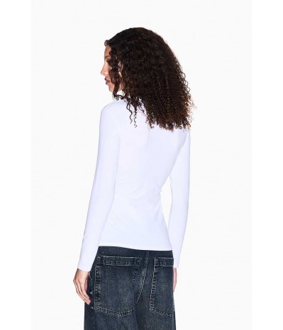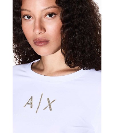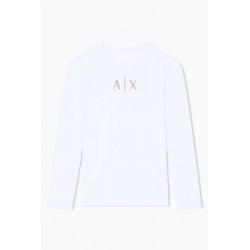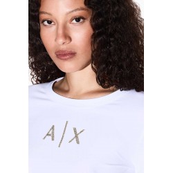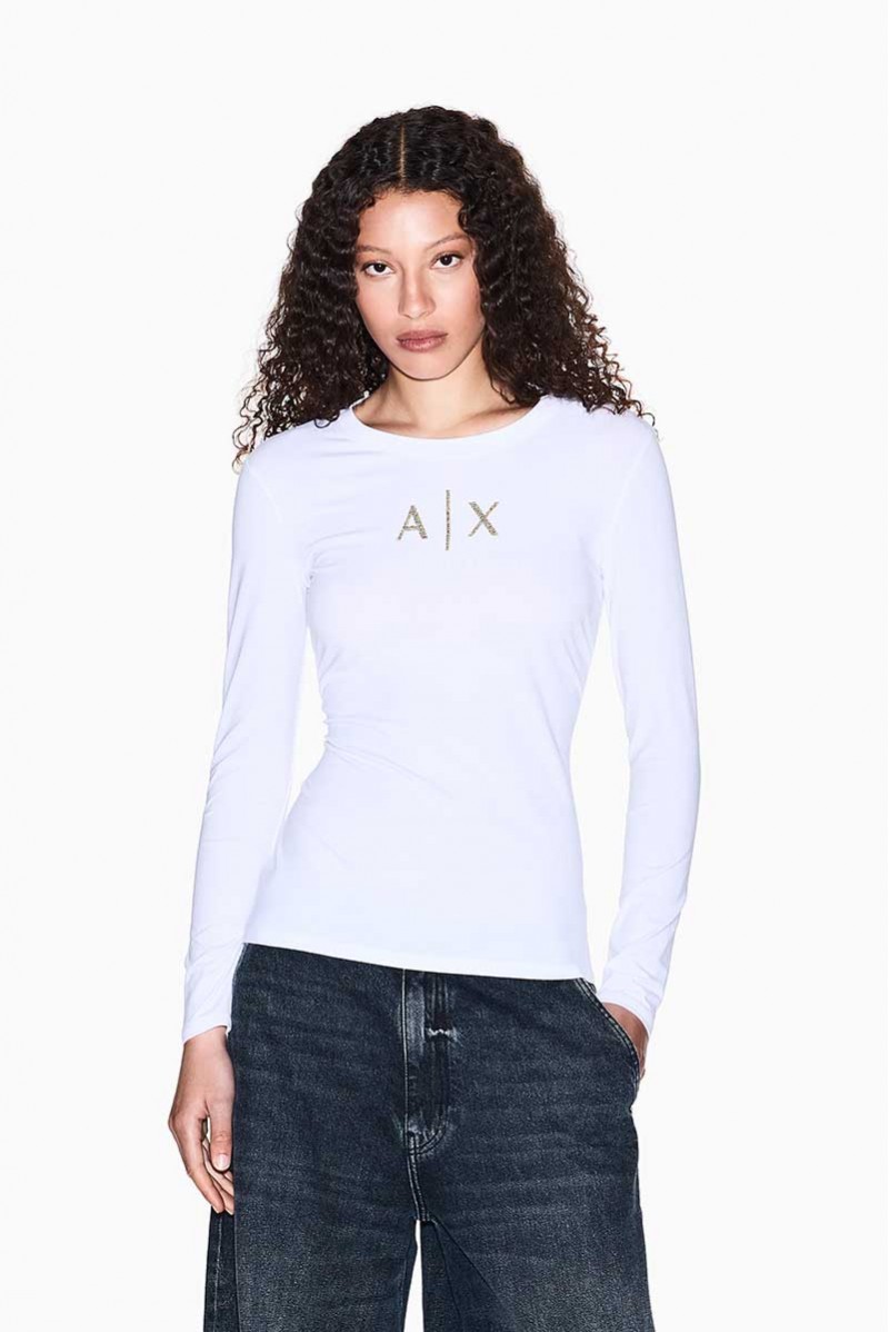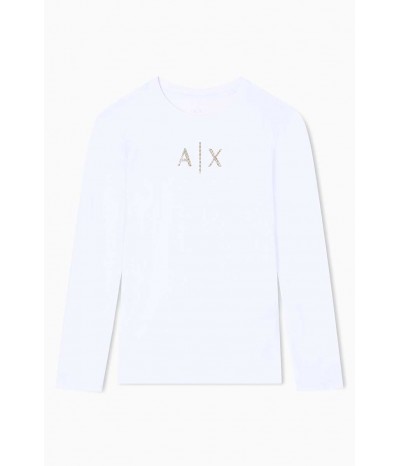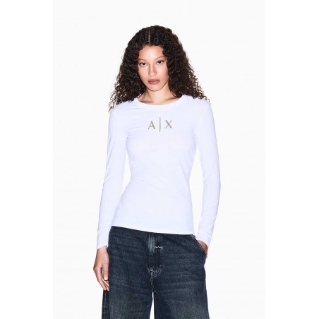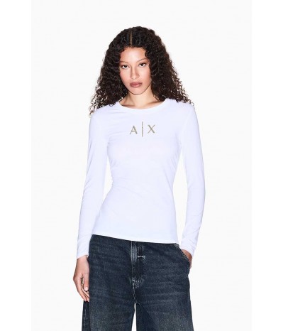 T-shirt Armani Exchange a manica lunga realizzata in morbido cotone stretch, che assicura comfort, vestibilità aderente e libertà di movimento. Il design minimal e versatile è impreziosito dal logo frontale in strass dorati, dettaglio luminoso che dona un tocco femminile e raffinato.Un capo iconico e intramontabile, perfetto per creare outfit casual-chic, da indossare con jeans, gonne o pantaloni per look versatili che uniscono praticità ed eleganza contemporanea.