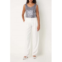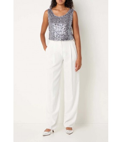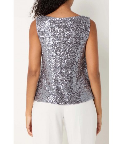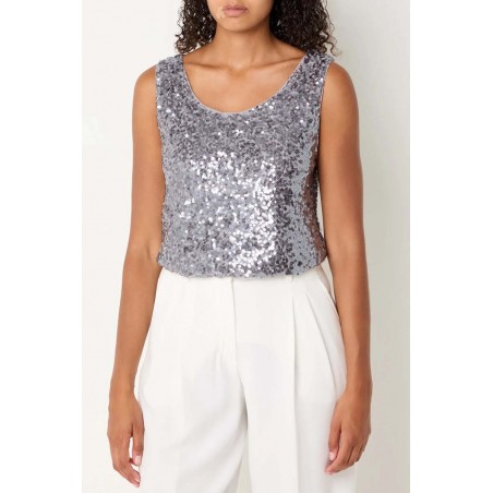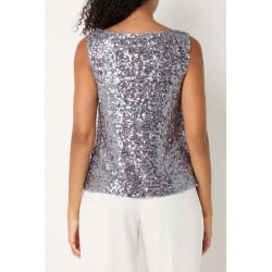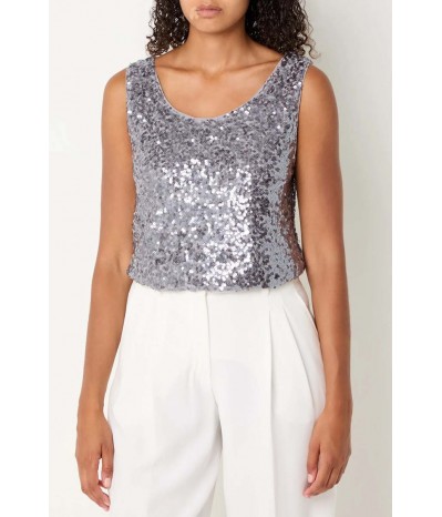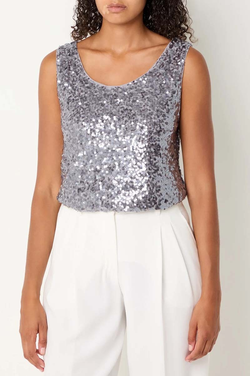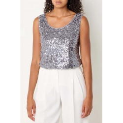 Top Pannyblack, elegante e sofisticato, in jersey di tulle stretch è impreziosito da paillettes ricamate che donano luminosità e movimento al look. Le linee che sfiorano il corpo valorizzano la silhouette con delicatezza, senza rinunciare al comfort.Il modello presenta uno scollo tondo classico, mentre la fodera interna in jersey liscio assicura morbidezza a contatto con la pelle e una vestibilità impeccabile.