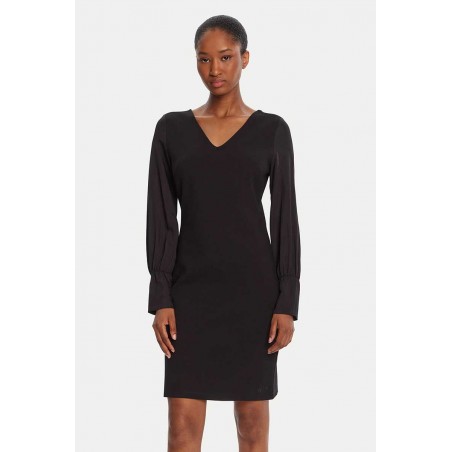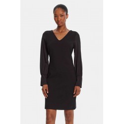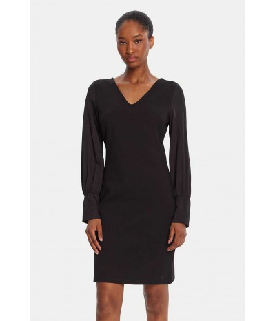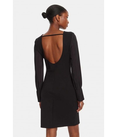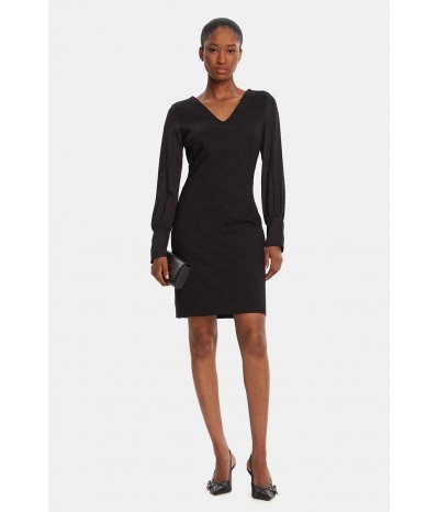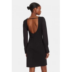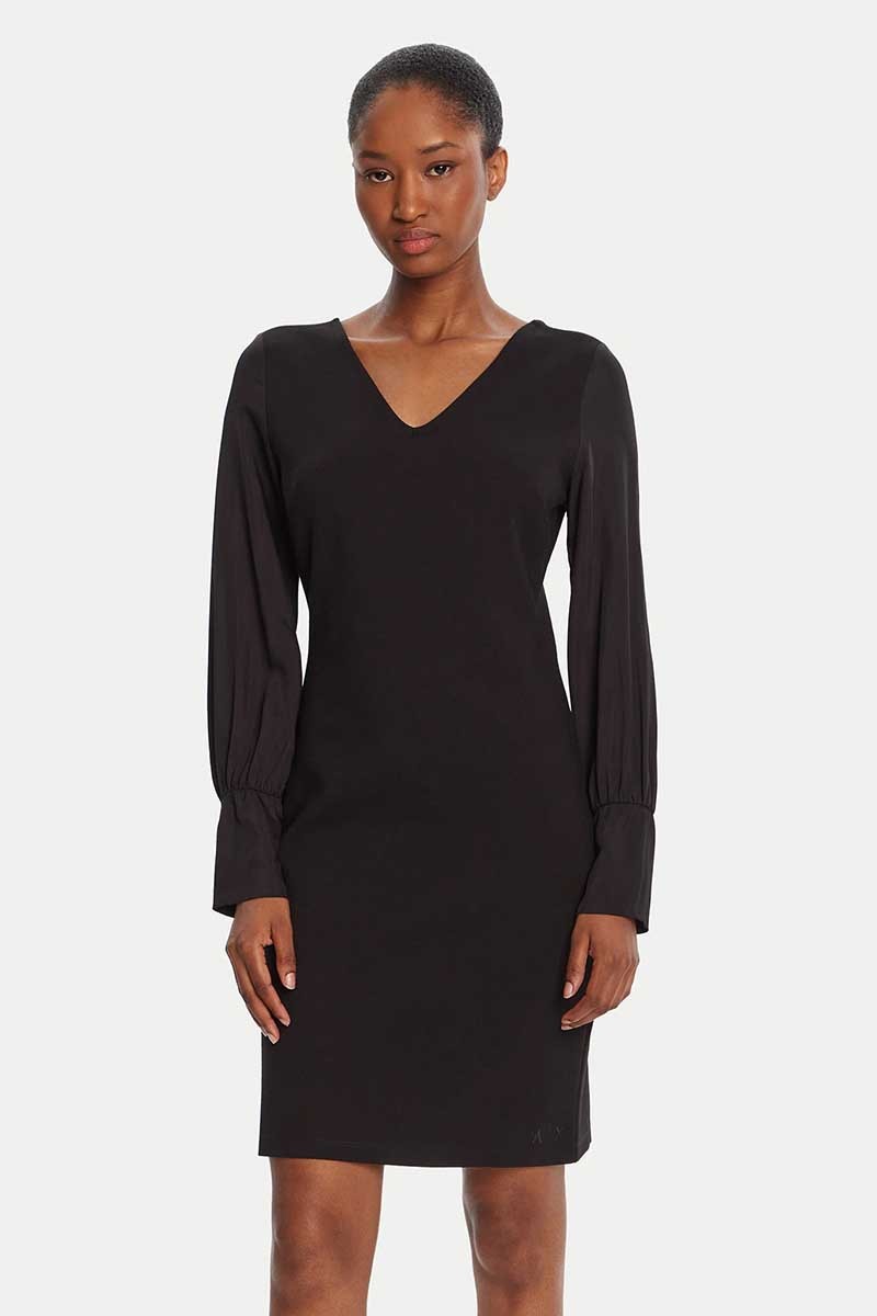 Abito tubino Armani Exchange realizzato in misto viscosa elasticizzato, che avvolge la silhouette con eleganza garantendo comfort e una vestibilità impeccabile. Il modello presenta maniche lunghe e un raffinato scollo a V sul davanti, che dona femminilità e slancia la figura.Sul retro, una profonda scollatura conferisce al capo un tocco sensuale e sofisticato