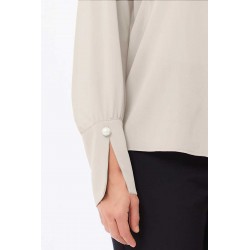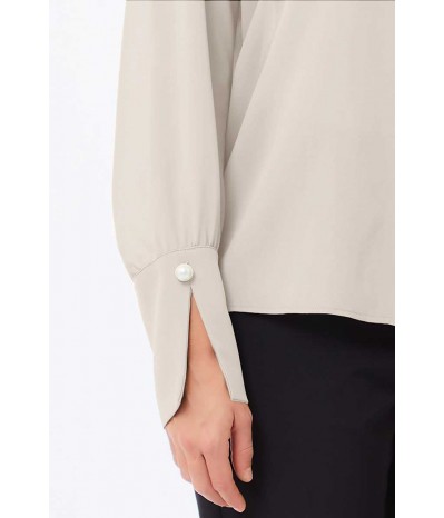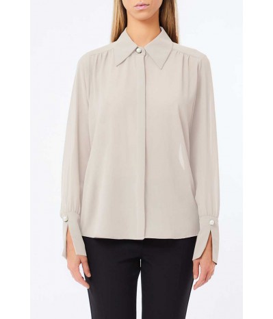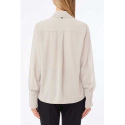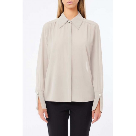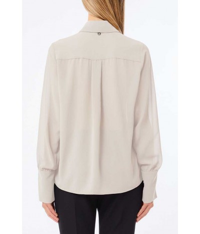 Camicia Liu Jo realizzata in fluida georgette, dal design sofisticato e femminile. Il modello presenta un raffinato colletto alla francese decorato con perla e maniche lunghe impreziosite da polsi con spacchetto e dettaglio perla, che donano eleganza e ricercatezza.La chiusura coperta con bottoni mantiene il design essenziale e pulito, mentre il logo in metallo sul retro sottolinea l’identità del brand. La camicia è realizzata con attenzione alla sostenibilità ed è un prodotto Made in Italy, garanzia di qualità e artigianalità.