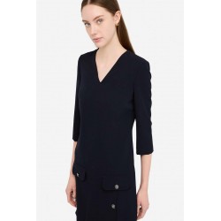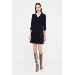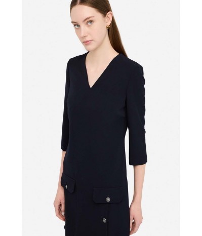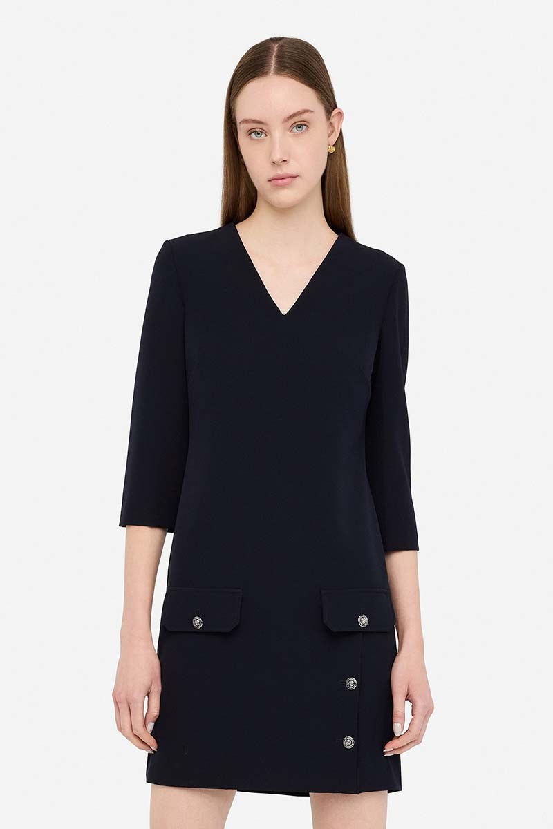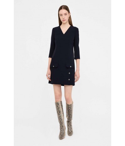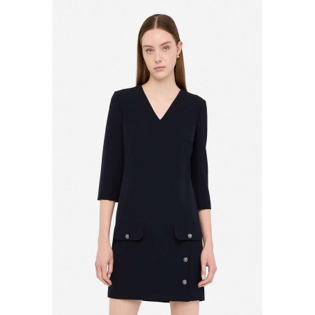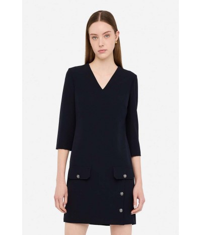 Abito corto Liu Jo realizzato in tessuto tecnico stretch, che garantisce comfort, vestibilità aderente e una linea femminile e valorizzante. Il modello presenta un elegante scollo a V che slancia la figura e maniche corte dal taglio essenziale.Il design è arricchito da tasche frontali funzionali e da bottoni lavorati, dettaglio sofisticato che impreziosisce il capo con un tocco raffinato.