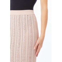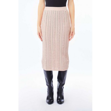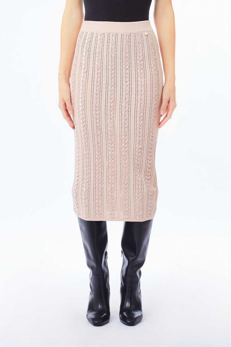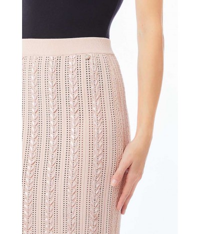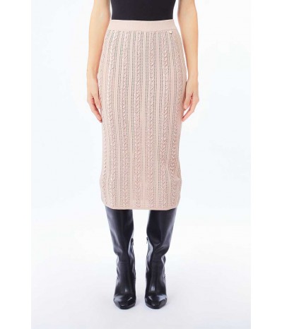 Gonna longuette Liu Jo realizzata in maglia di misto viscosa, confortevole e avvolgente. Il modello è impreziosito da una raffinata lavorazione punzonata, che dona leggerezza e femminilità, arricchita da eleganti nastri intrecciati che creano un dettaglio distintivo e moderno.La vita elasticizzata con cintone assicura comfort e una vestibilità perfetta, mentre il logo in metallo applicato sul retro firma il capo con discrezione.