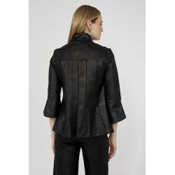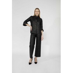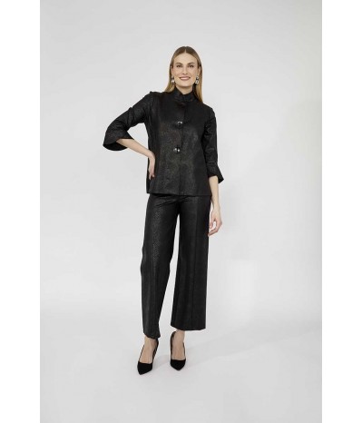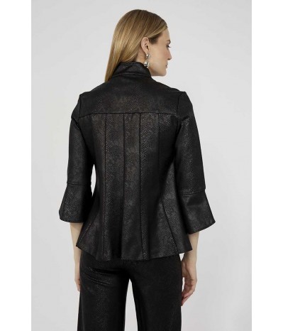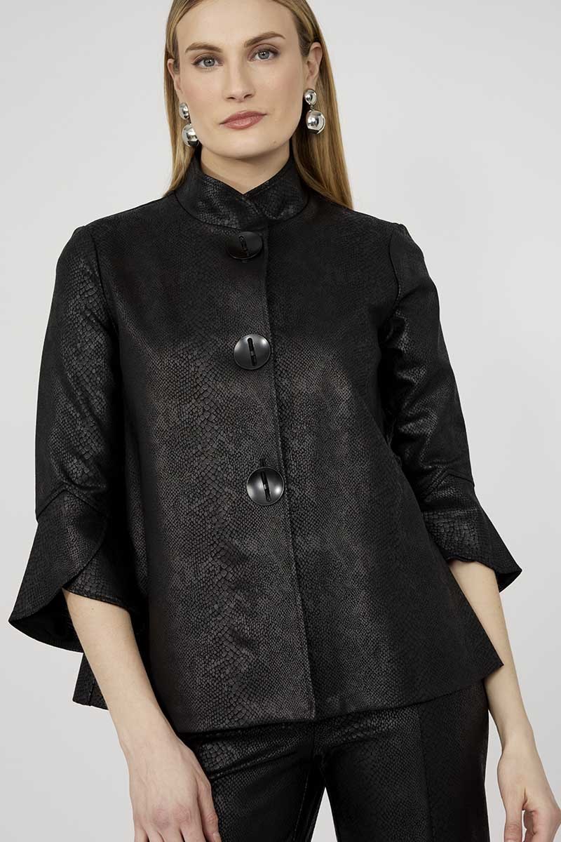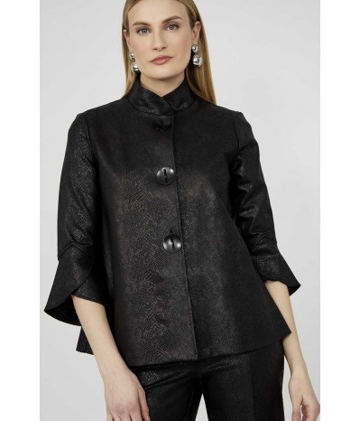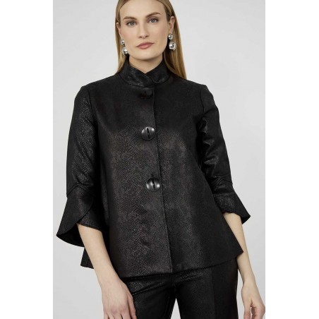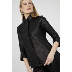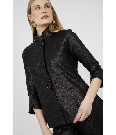 Giacca destrutturata firmata Frank Lyman rappresenta un perfetto equilibrio tra eleganza e originalità. Il collo alla coreana conferisce un tocco moderno e sofisticato, impreziosito da grandi bottoni in metallo che ne esaltano il design distintivo. Realizzata con una manica a 3/4 in materiale effetto similpelle pitonato in tinta, la giacca gioca su contrasti di texture che aggiungono profondità e personalità al capo. La costruzione destrutturata garantisce comfort e leggerezza, adattandosi con naturalezza alla figura per una vestibilità impeccabile.