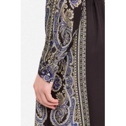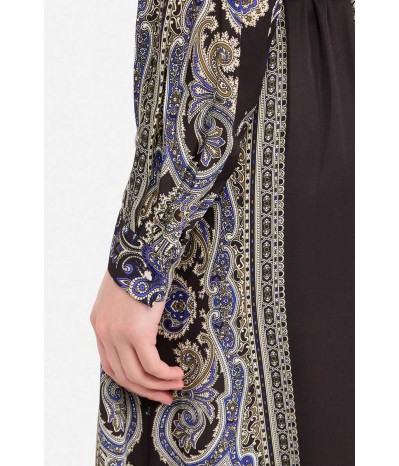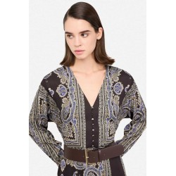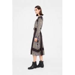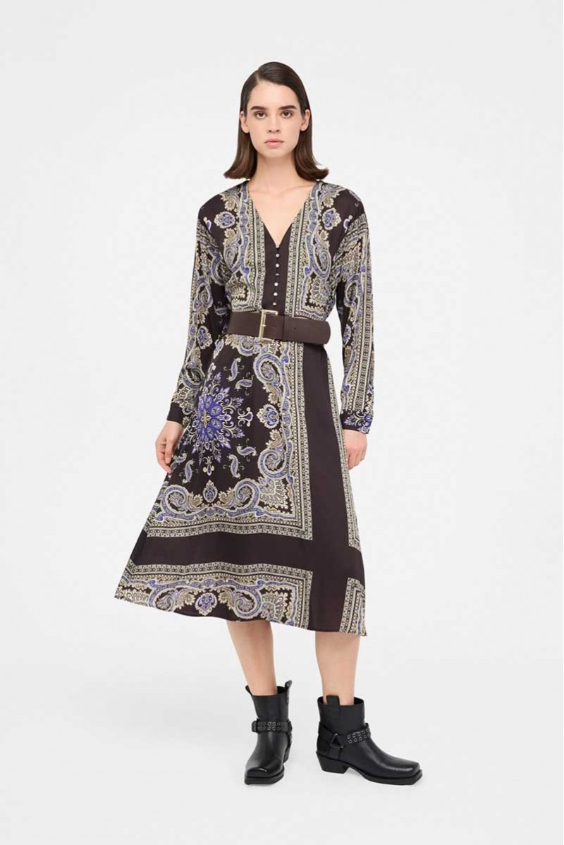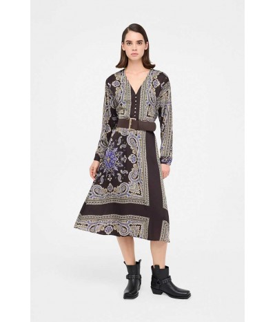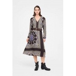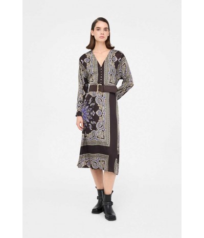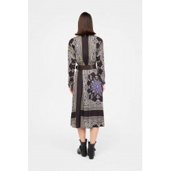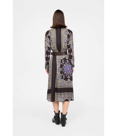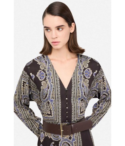 Abito Liu Jo realizzato in morbida viscosa con fantasia all over, dal design raffinato e femminile. Il modello è caratterizzato da un elegante colletto alla coreana e da polsini chiusi con bottone, che donano struttura e dettagli ricercati.La scollatura frontale è impreziosita da una fila di bottoni decorativi, mentre la vita elasticizzata sul retro assicura comfort e una vestibilità perfetta. Completa il look la cintura coordinata, ideale per valorizzare la silhouette.