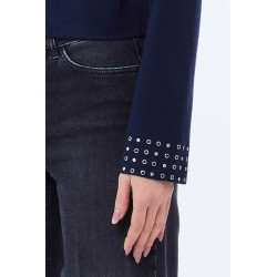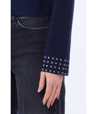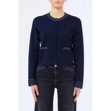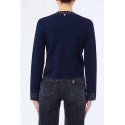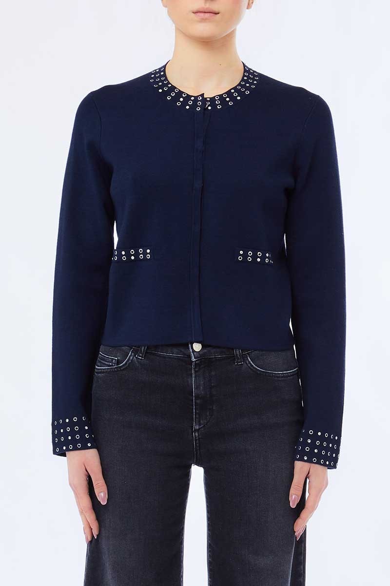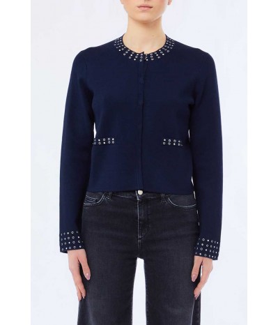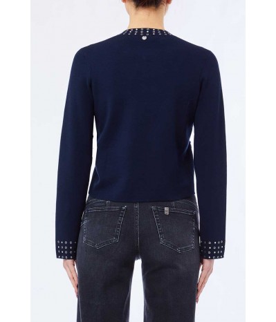 Giacca Liu Jo realizzata in maglia con filati in misto viscosa, morbidi e confortevoli. Il modello è impreziosito da strass applicati, che donano luminosità e un tocco raffinato al design.Dotata di tasche frontali funzionali e di una chiusura con bottoni a pressione nascosti, mantiene una linea pulita ed elegante. Le comode tasche ne esaltano la praticità senza rinunciare allo stile.