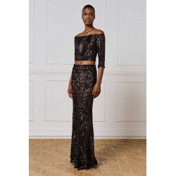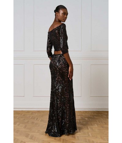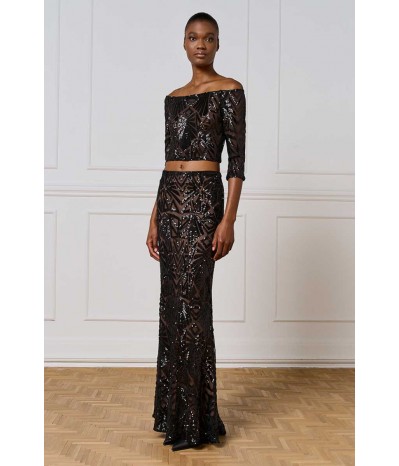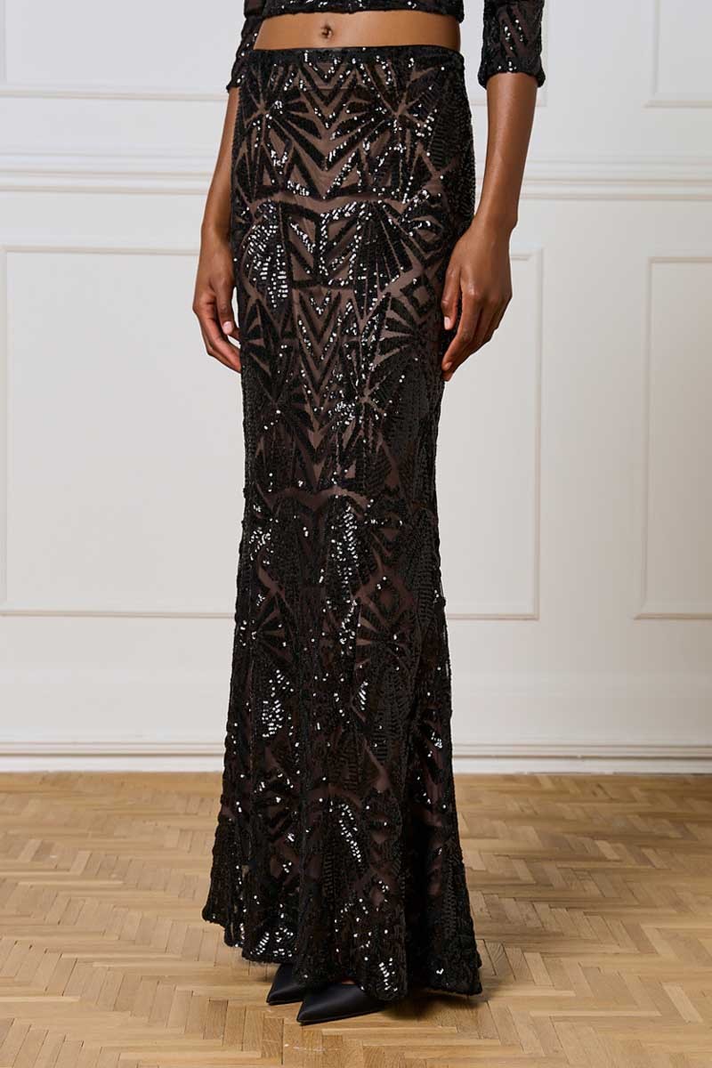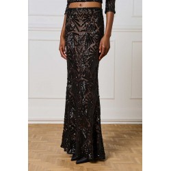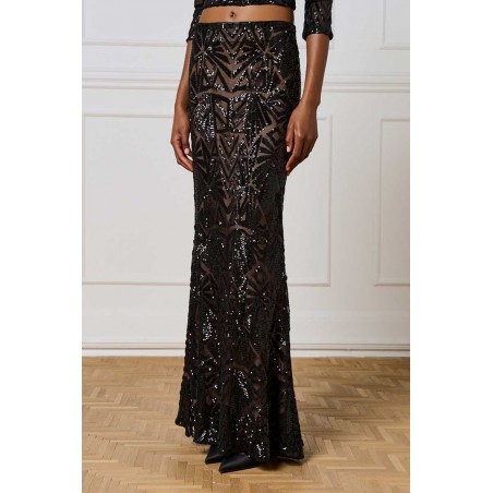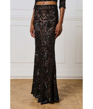 Gonna lunga Access dal design elegante e scenografico, caratterizzata da un raffinato effetto velato impreziosito da una fantasia di paillettes che dona luminosità e movimento al capo. Il modello è completato da un sottogonna color nude, che crea un delicato gioco di trasparenze mantenendo comfort e portabilità.La chiusura con zip sul retro assicura una vestibilità pratica e sicura, mantenendo una linea fluida e sofisticata.