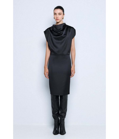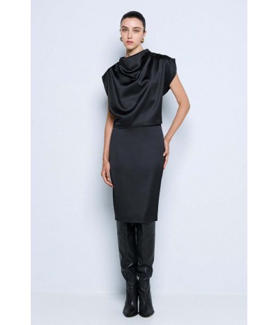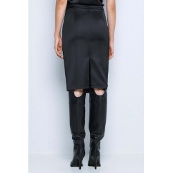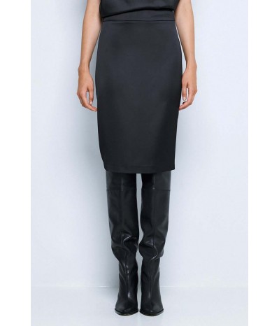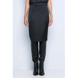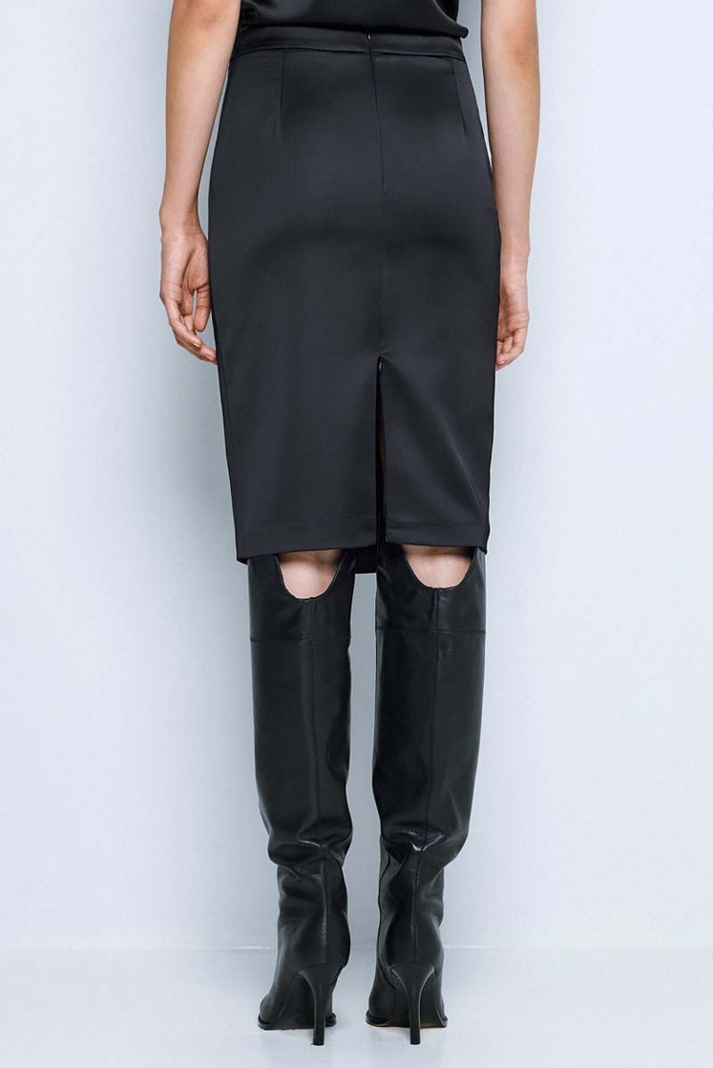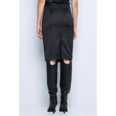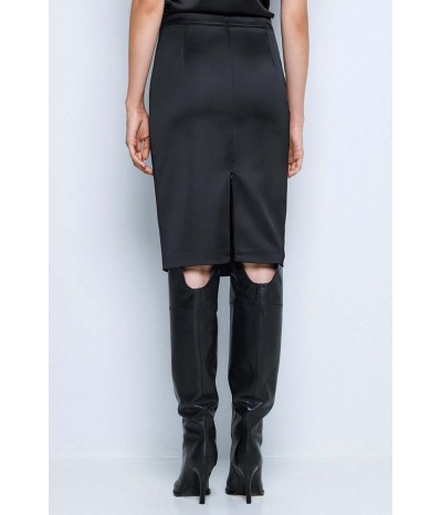 Gonna longuette Access realizzata in raso fluido e luminoso, dal design elegante e contemporaneo. Il modello presenta una particolare doppia zip decorativa in vita sul retro, che dona carattere e modernità al capo, mentre il delicato spacchetto posteriore aggiunge femminilità e praticità nei movimenti.
