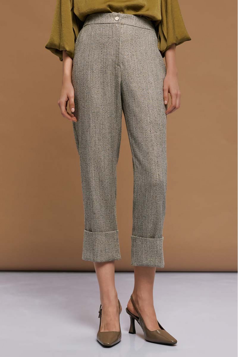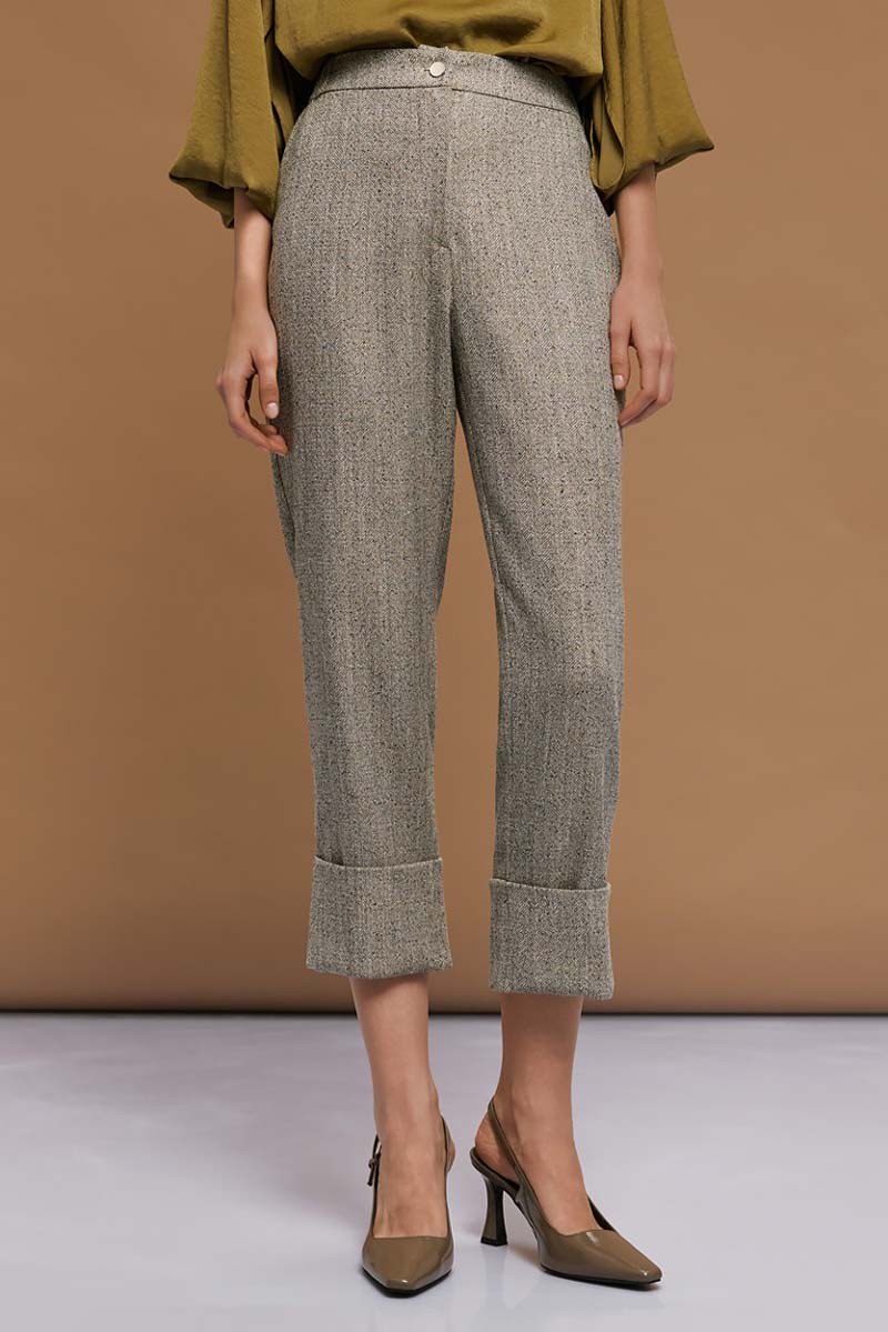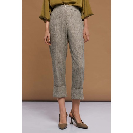 Pantalone Access dal design sartoriale e contemporaneo, realizzato in tessuto con effetto spigato, che conferisce un’allure elegante e senza tempo. Il modello è caratterizzato da un lungo risvolto al fondo, dettaglio distintivo che aggiunge un tocco di stile moderno, e da pratiche tasche a filo laterali che mantengono la linea pulita ed essenziale.