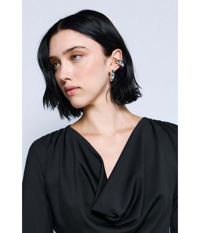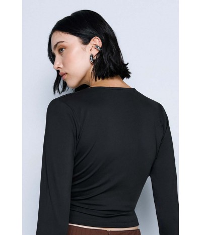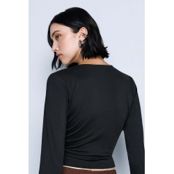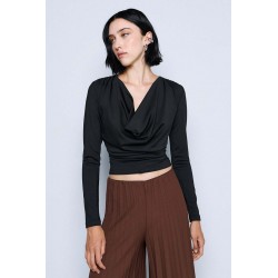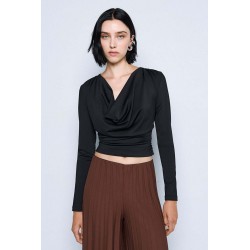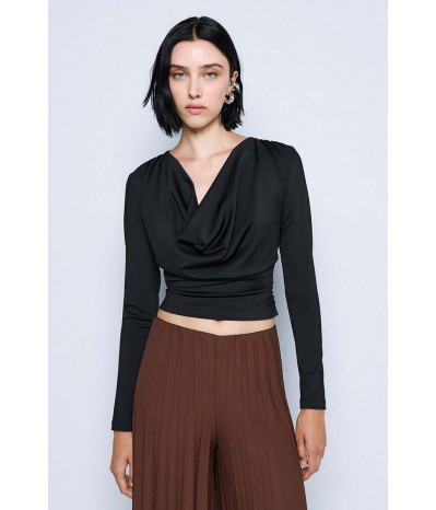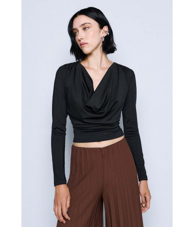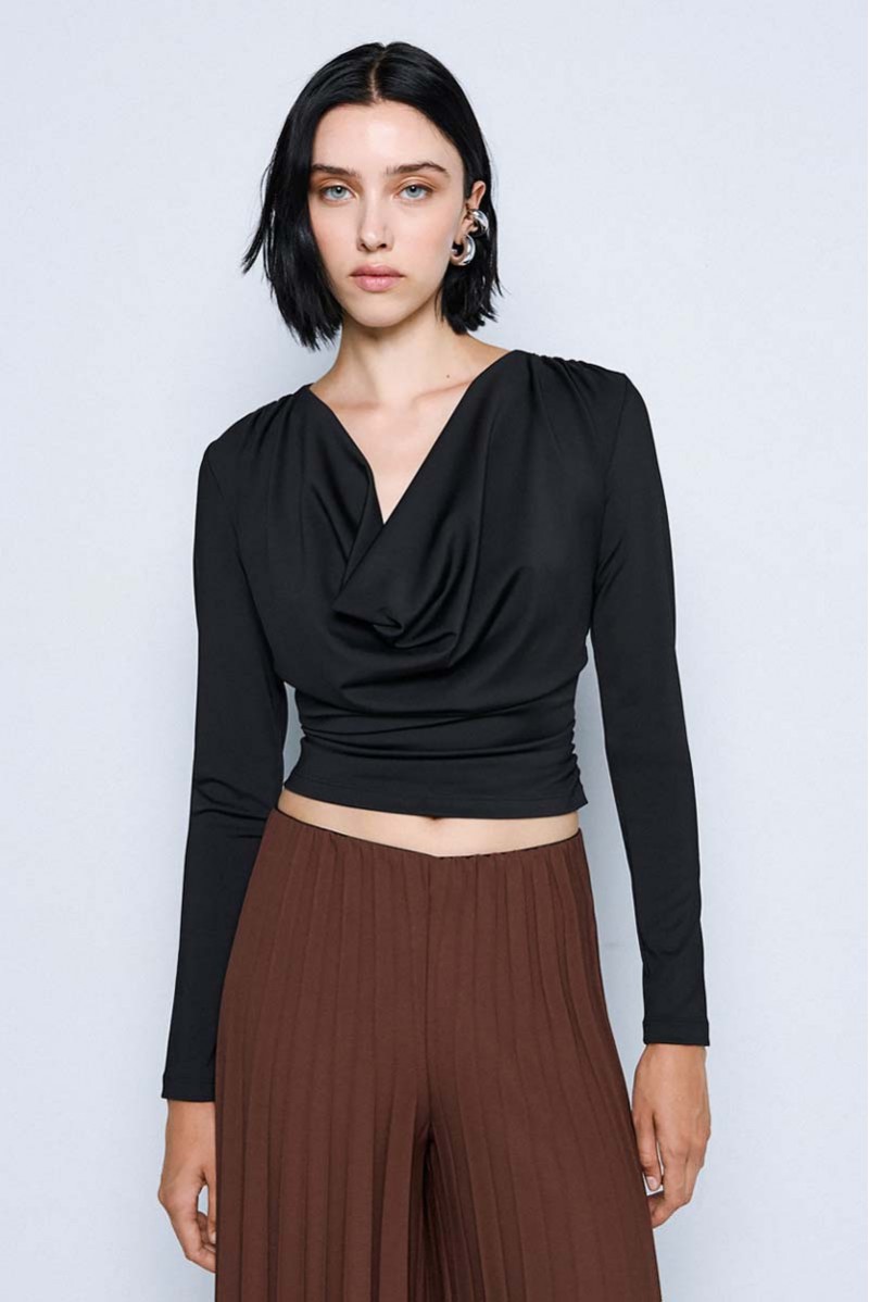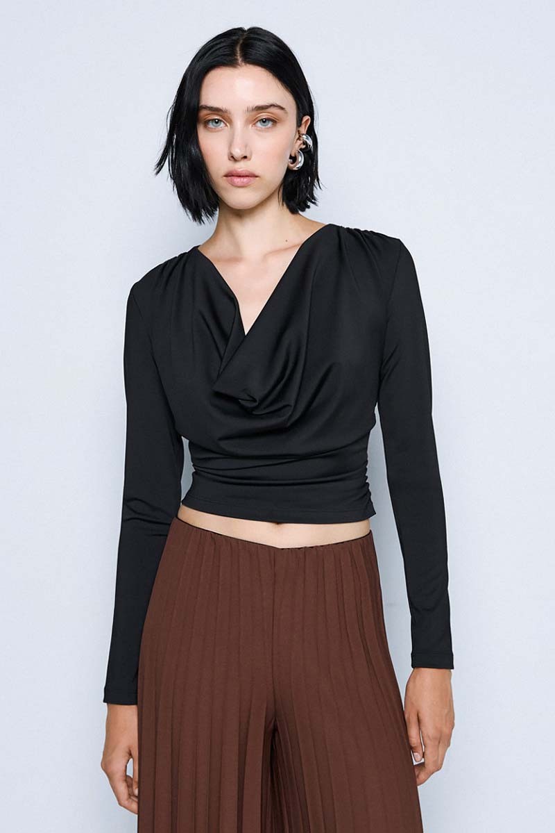 Blusa Access realizzata in jersey stretch, morbido ed elasticizzato, che assicura comfort e una vestibilità impeccabile. Il modello è impreziosito da un elegante bavero e da delicate arricciature sui fianchi e sulle spalle, che donano movimento e un tocco femminile al design.