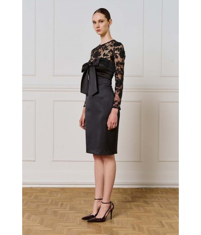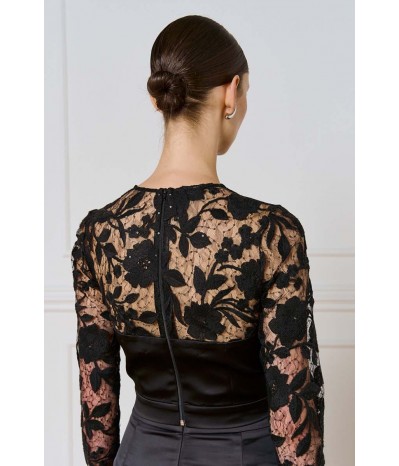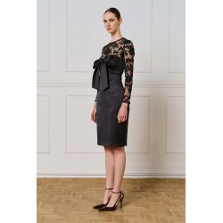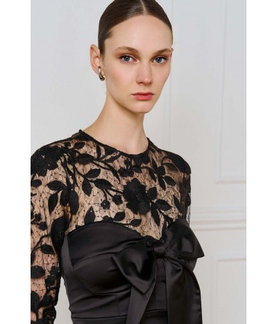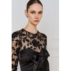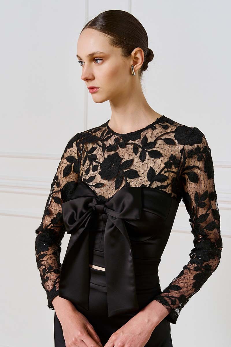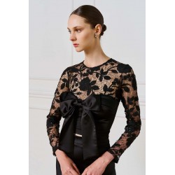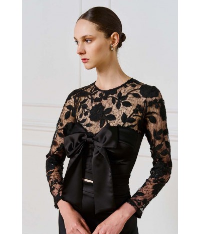 Corpetto Access elegante e ricercato, realizzato con un sofisticato mix di pizzo e raso che unisce romanticismo e luminosità. Il modello è impreziosito da applicazioni di piccole paillettes che donano delicati riflessi, mentre la spilla con fiocco in raso aggiunge un dettaglio glamour e distintivo.La chiusura con zip sul retro assicura una vestibilità comoda e aderente, mantenendo una linea femminile e raffinata.