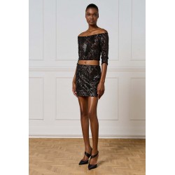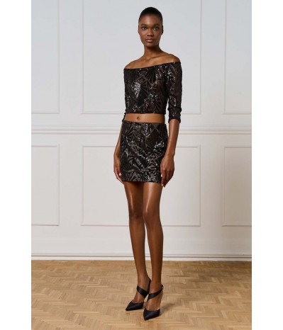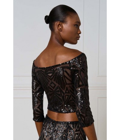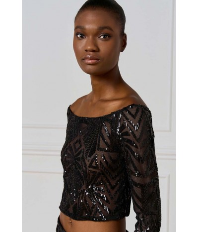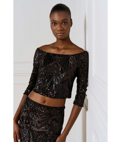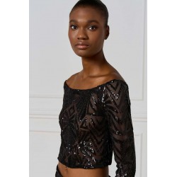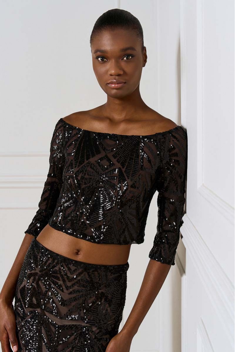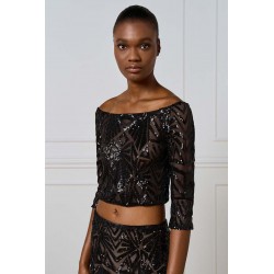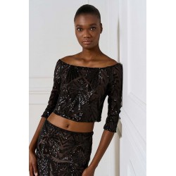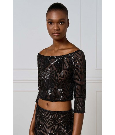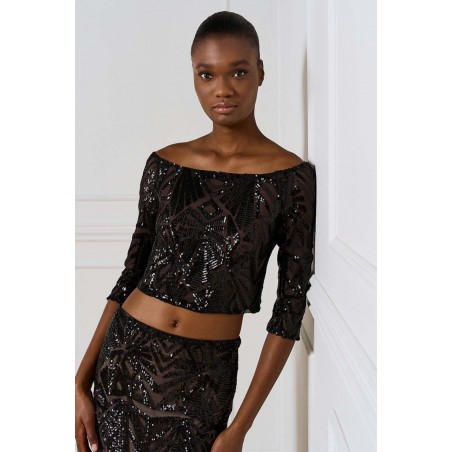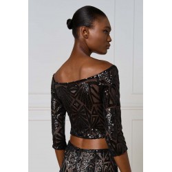 Top corto Access dall’allure glamour e sofisticata, realizzato in tulle stretch con applicazioni di paillettes che illuminano il capo con riflessi brillanti. Il modello presenta un raffinato scollo a barca che valorizza la linea delle spalle e una manica a 3/4, perfetta per un look elegante ma moderno.La presenza di una base neutra sottostante garantisce copertura e comfort, mantenendo la trasparenza raffinata del tulle come protagonista.