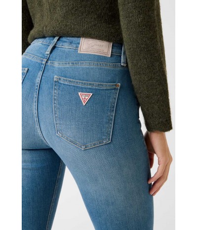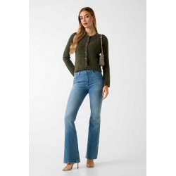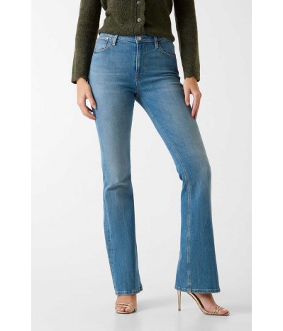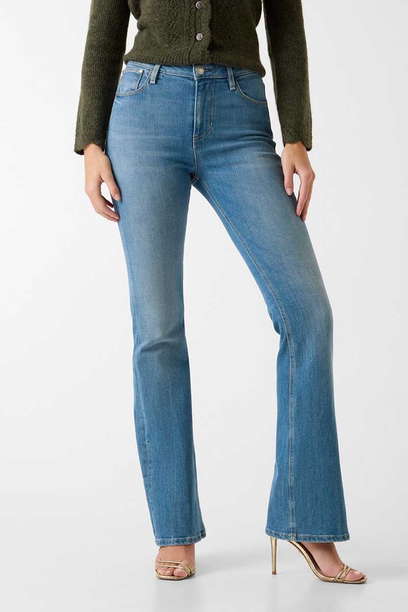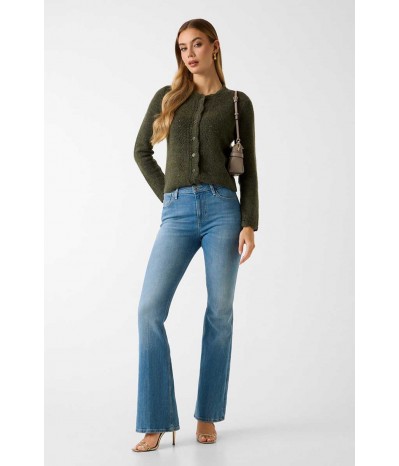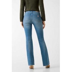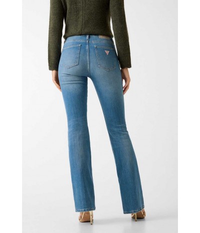 Jeans Guess bootcut con gamba flare e vita alta, perfetti per valorizzare la silhouette. Modello 5 tasche con chiusura a bottone e lavaggio medio versatile.