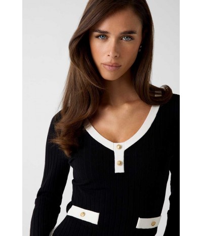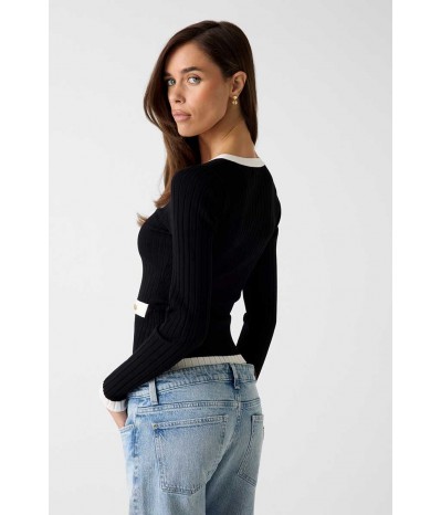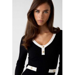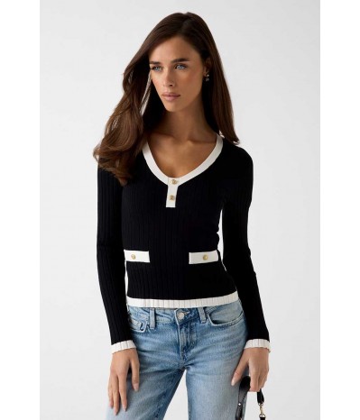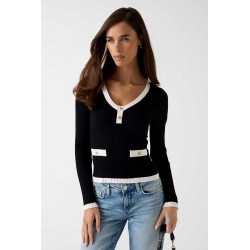 Maglia Guess donna a maniche lunghe realizzata in filo di cotone, leggera e confortevole. La scollatura a V è impreziosita da bottoni oro logati che si ripetono sui finti taschini anteriori, per un tocco elegante e distintivo.