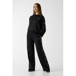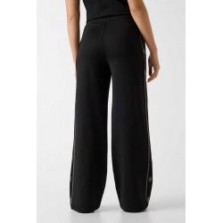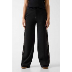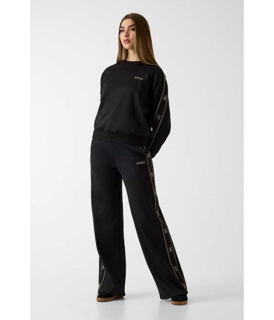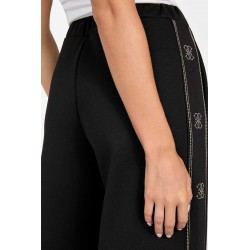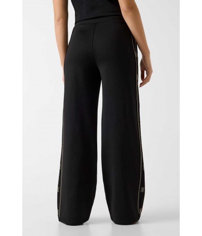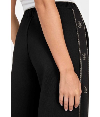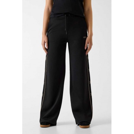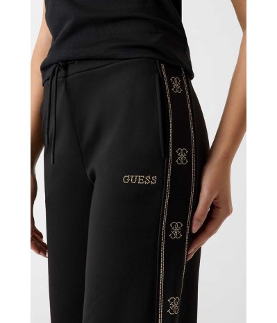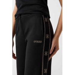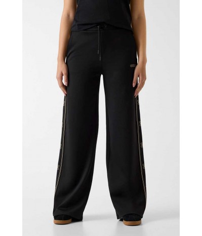 Pantaloni Guess in viscosa stretch con gamba larga e vestibilità regolare, ideali per un look comodo e contemporaneo. La vita elasticizzata con coulisse assicura praticità, mentre le applicazioni ai bordi con logo 4G oro e la scritta lettering oro valorizzano il design.