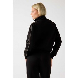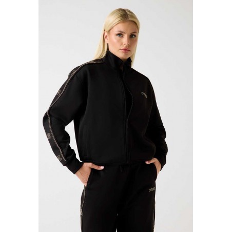Felpa Guess con zip frontale, senza cappuccio, ideale per uno stile pratico e moderno. Le tasche laterali garantiscono funzionalità, mentre i dettagli luminosi sulle maniche con loghi aggiungono un tocco distintivo.