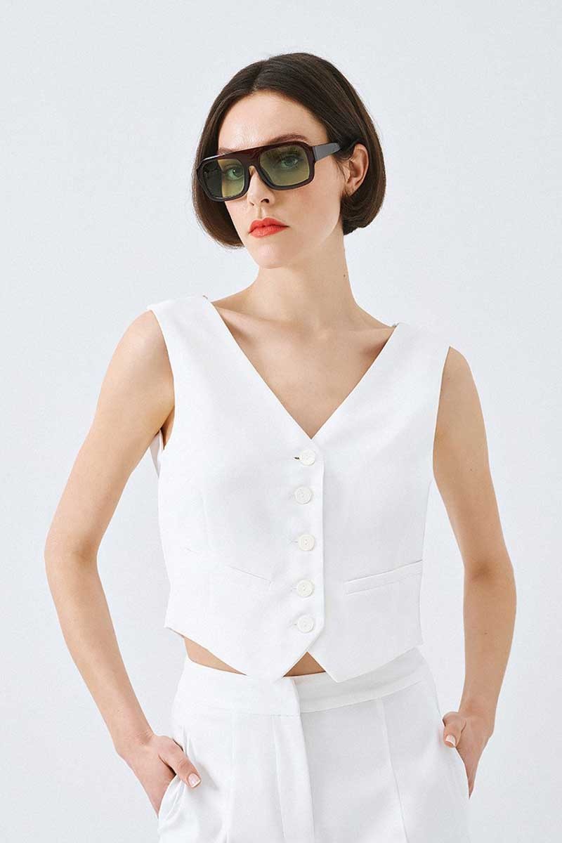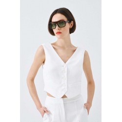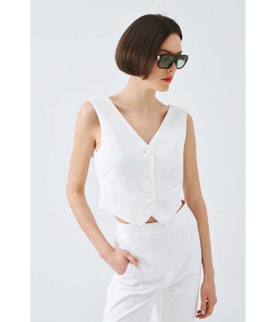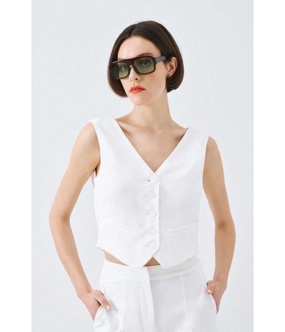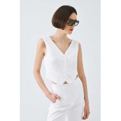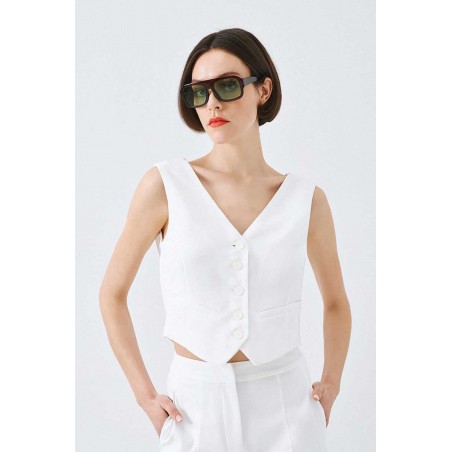 Gilet Access con chiusura frontale a bottoni tono su tono. Il particolare effetto bavero sul retro valorizza la silhouette con stile.