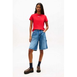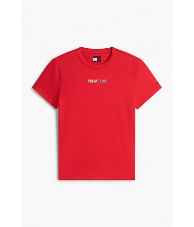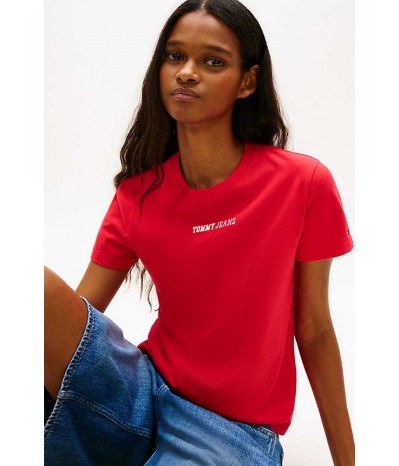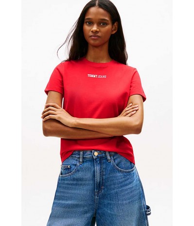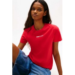 T-shirt Tommy Jeans girocollo in cotone, a manica corta e vestibilità aderente, con scritta logo frontale. Perfetta per un look casual e femminile.