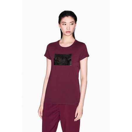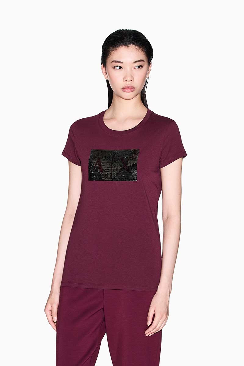 T-shirt Armani Exchange in morbido cotone, dal design essenziale e versatile. Il modello presenta un classico girocollo e una linea regolare che assicura comfort e praticità.Elemento protagonista è il logo centrale realizzato con maxi paillettes, dettaglio luminoso e di forte impatto che conferisce al capo un’allure glamour e contemporanea.