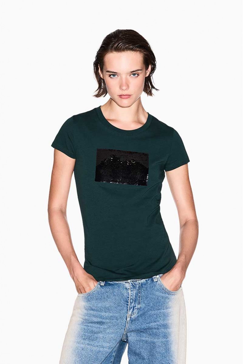 T-shirt Armani Exchange in morbido cotone, dal design essenziale e versatile. Il modello presenta un classico girocollo e una linea regolare che assicura comfort e praticità.Elemento protagonista è il logo centrale realizzato con maxi paillettes, dettaglio luminoso e di forte impatto che conferisce al capo un’allure glamour e contemporanea.