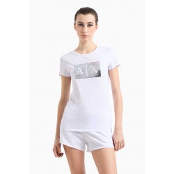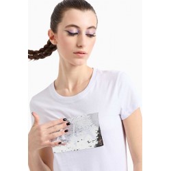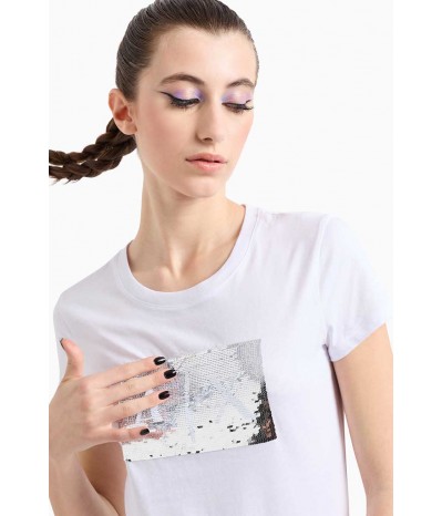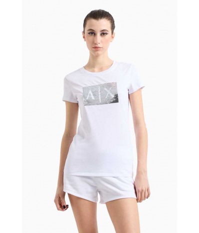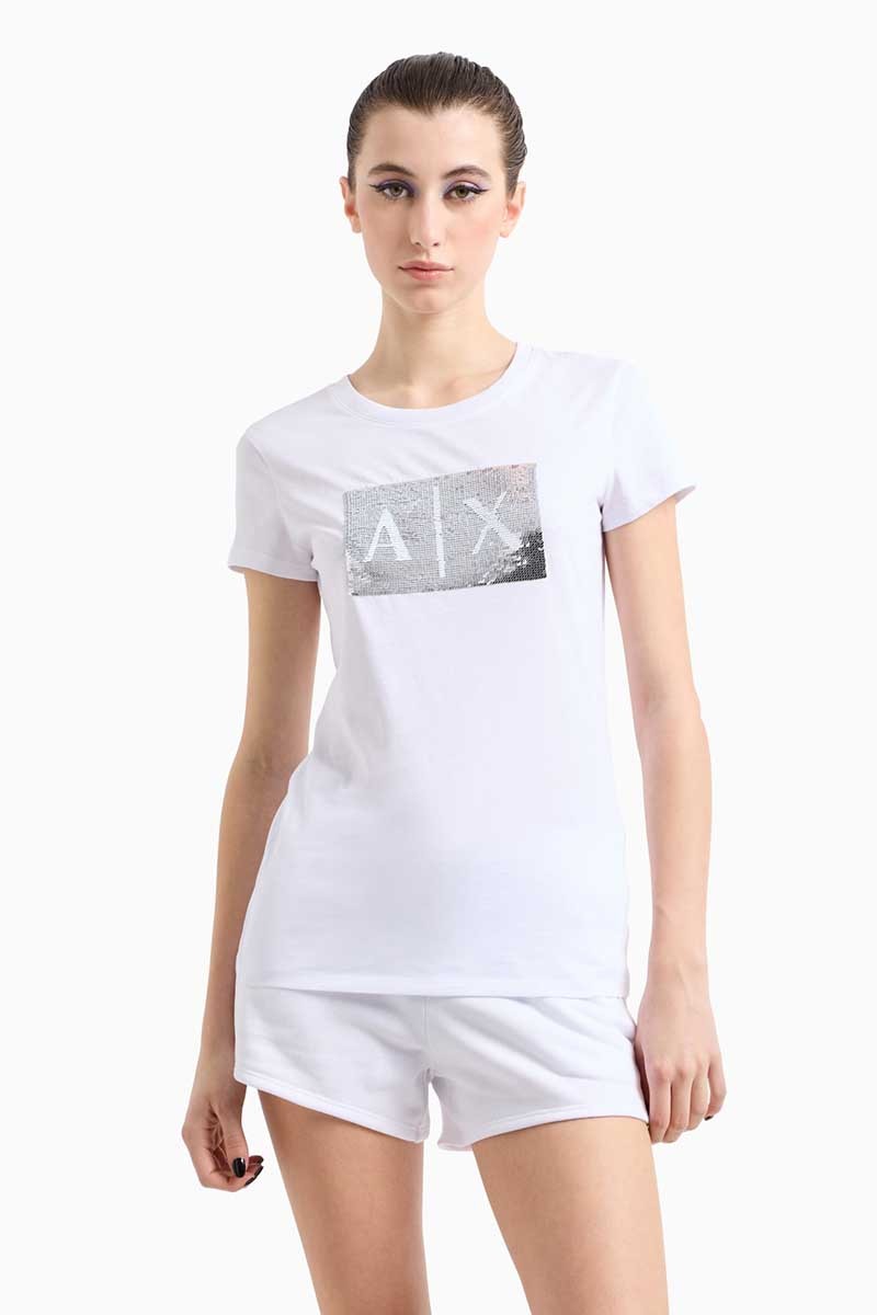 T-shirt Armani Exchange in morbido cotone, dal design essenziale e versatile. Il modello presenta un classico girocollo e una linea regolare che assicura comfort e praticità.Elemento protagonista è il logo centrale realizzato con maxi paillettes, dettaglio luminoso e di forte impatto che conferisce al capo un’allure glamour e contemporanea.