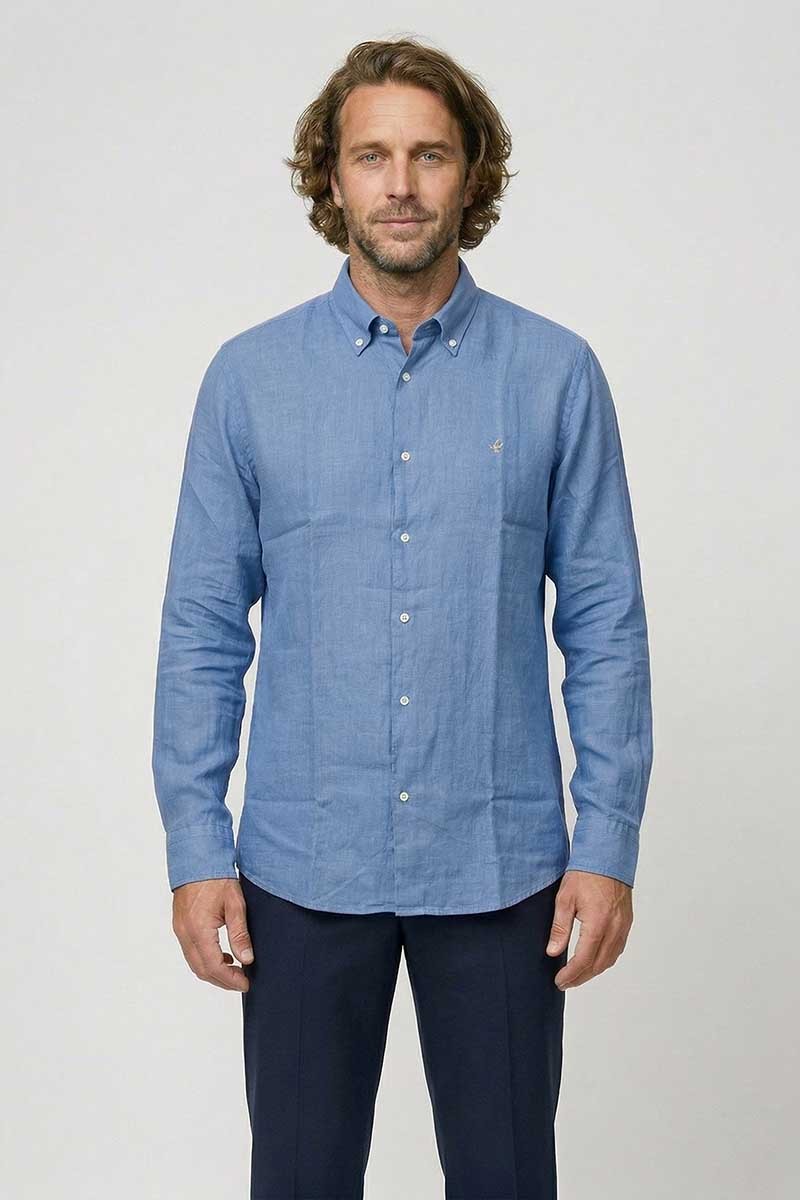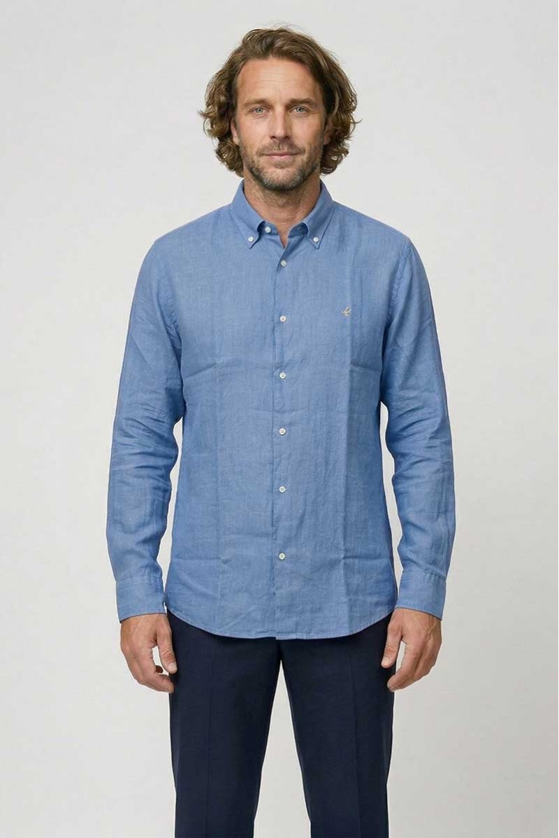 Camicia uomo Brooksfield in puro lino con fit regolare, ideale per la stagione più calda. Morbida e traspirante, presenta colletto button down e chiusura con bottoni centrali. Il logo sulla manica e i polsini con bottoni rendono il capo elegante e facile da abbinare.
