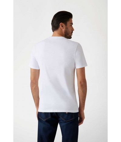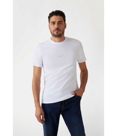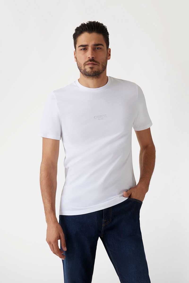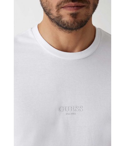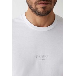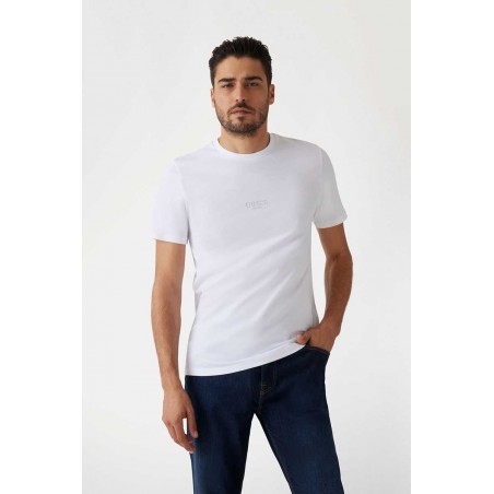 T-shirt uomo Guess a mezza manica con girocollo, realizzata in cotone fresco e confortevole. La mini scritta centrale in rilievo in gomma mette in evidenza il marchio con uno stile discreto. Disponibile anche in altri colori per abbinamenti versatili.