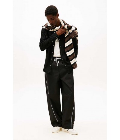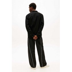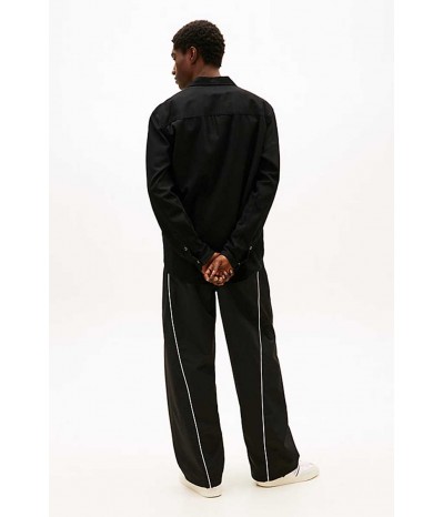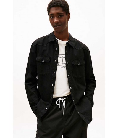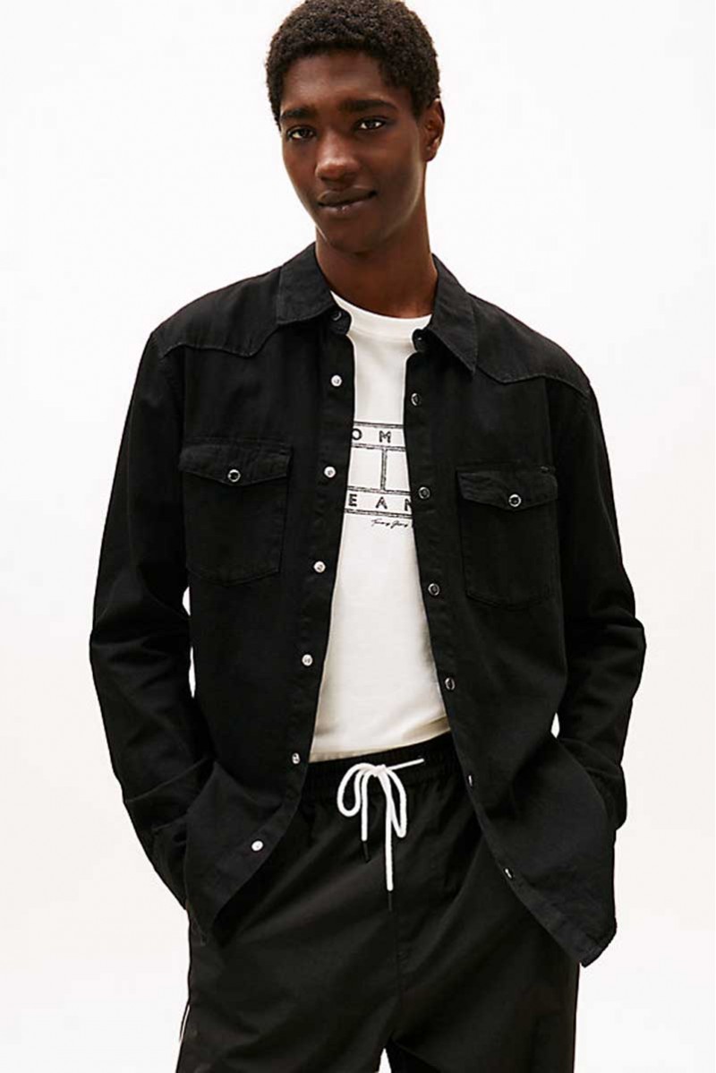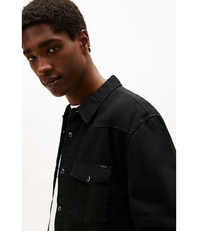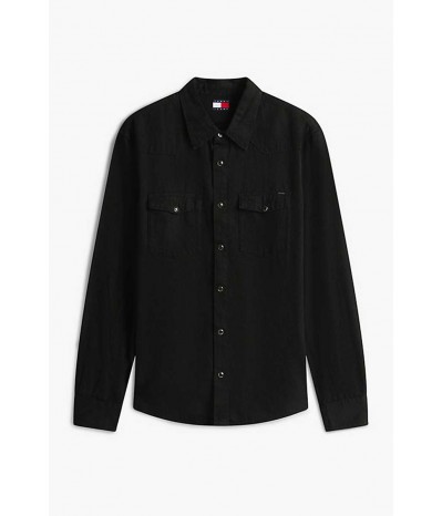 Camicia denim Tommy Jeans da uomo realizzata in cotone e viscosa per una vestibilità morbida. Il modello presenta colletto stile polo, chiusura con bottoni a clip e tasche sul petto con lo stesso dettaglio. Le maniche arrotolabili offrono un look più casual e dinamico.