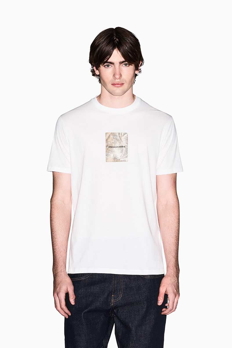 Maglia uomo Armani a mezze maniche in fresco cotone, ideale per la stagione primavera estate. Al centro è cucito un quadrato in raso fantasia che mette in risalto il marchio con un dettaglio originale. Perfetta per un look casual moderno e curato.