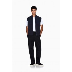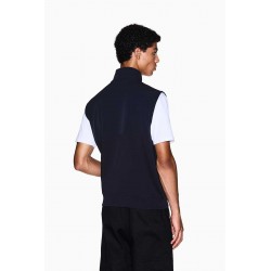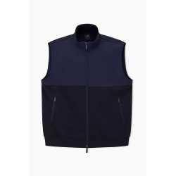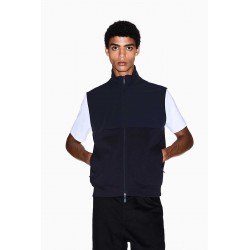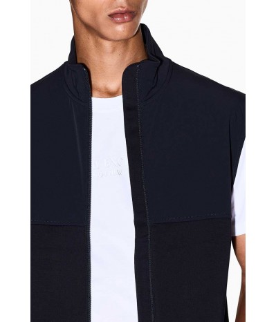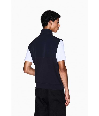 Smanicato Armani uomo in felpa, caratterizzato da un mix di tessuto tecnico e cotone che crea un contrasto di tendenza. Completo di colletto alto, zip centrale e zip laterali per maggiore comfort. Ideale per outfit casual e sportivi nelle mezze stagioni.